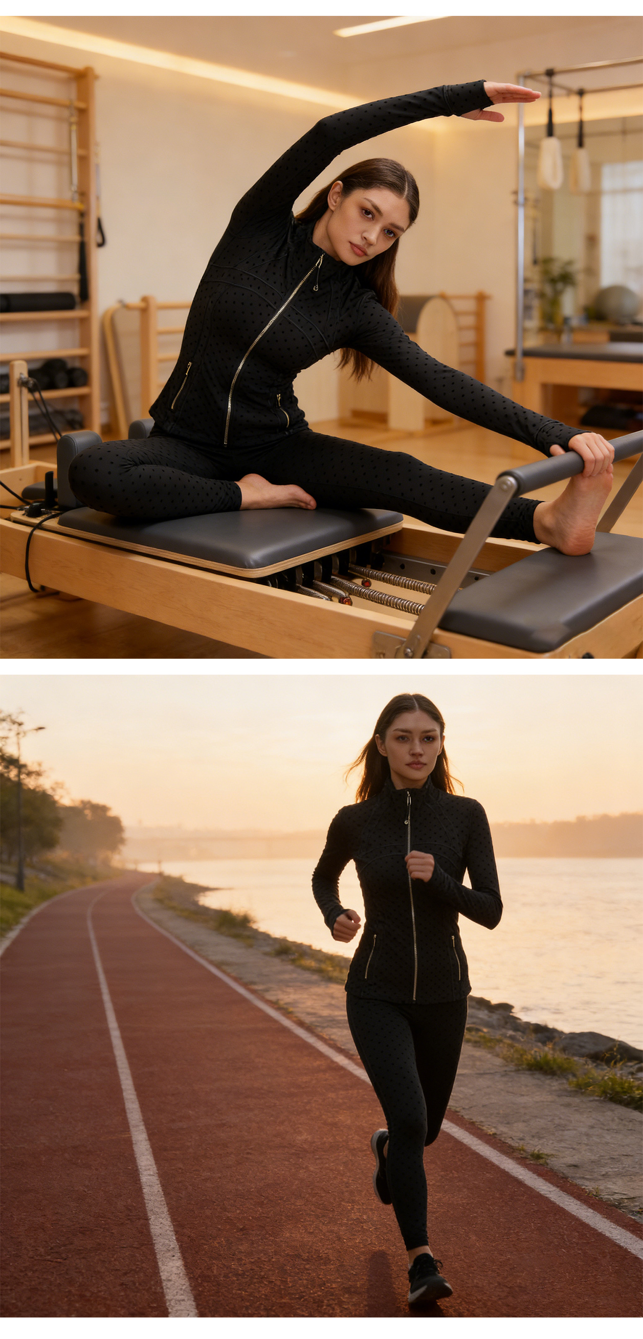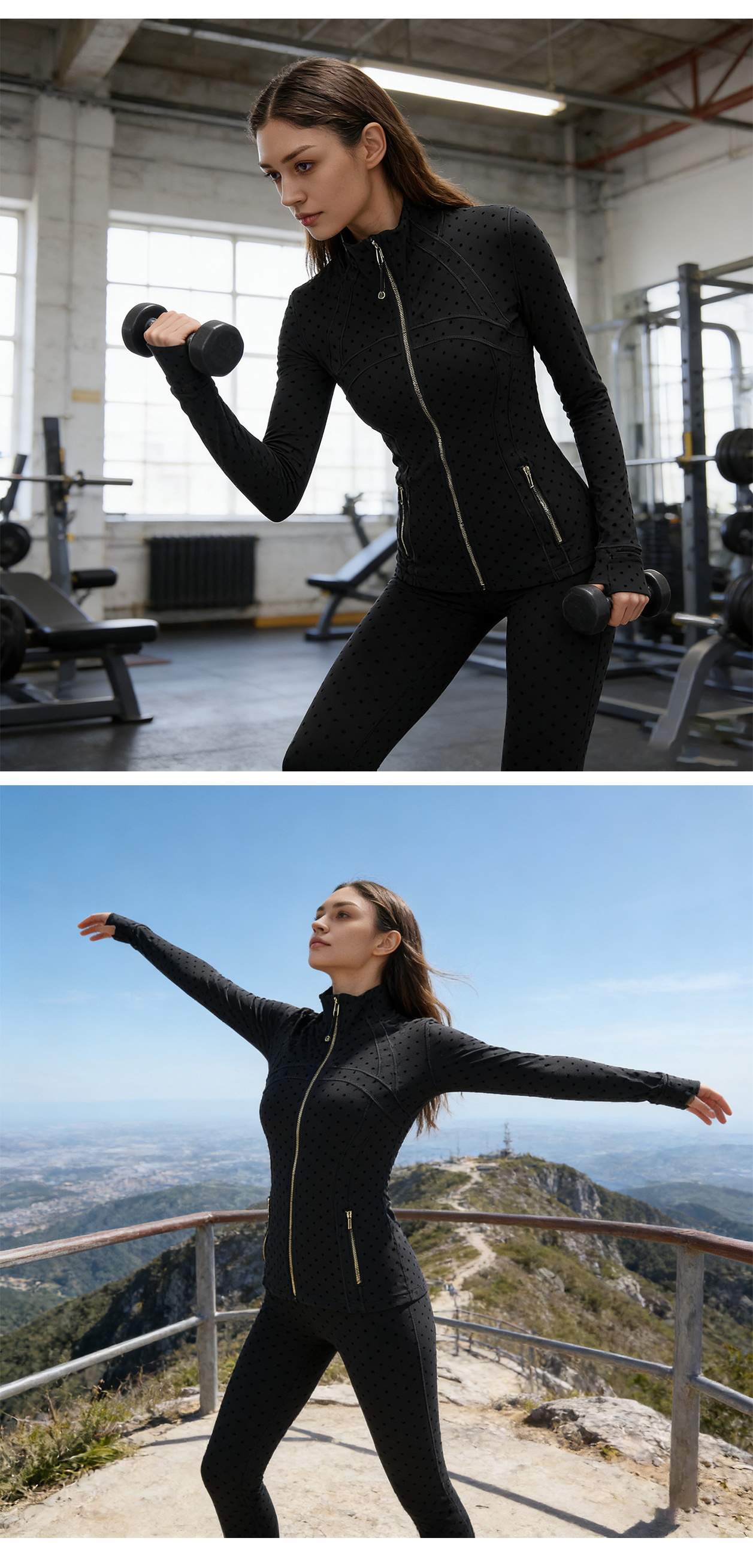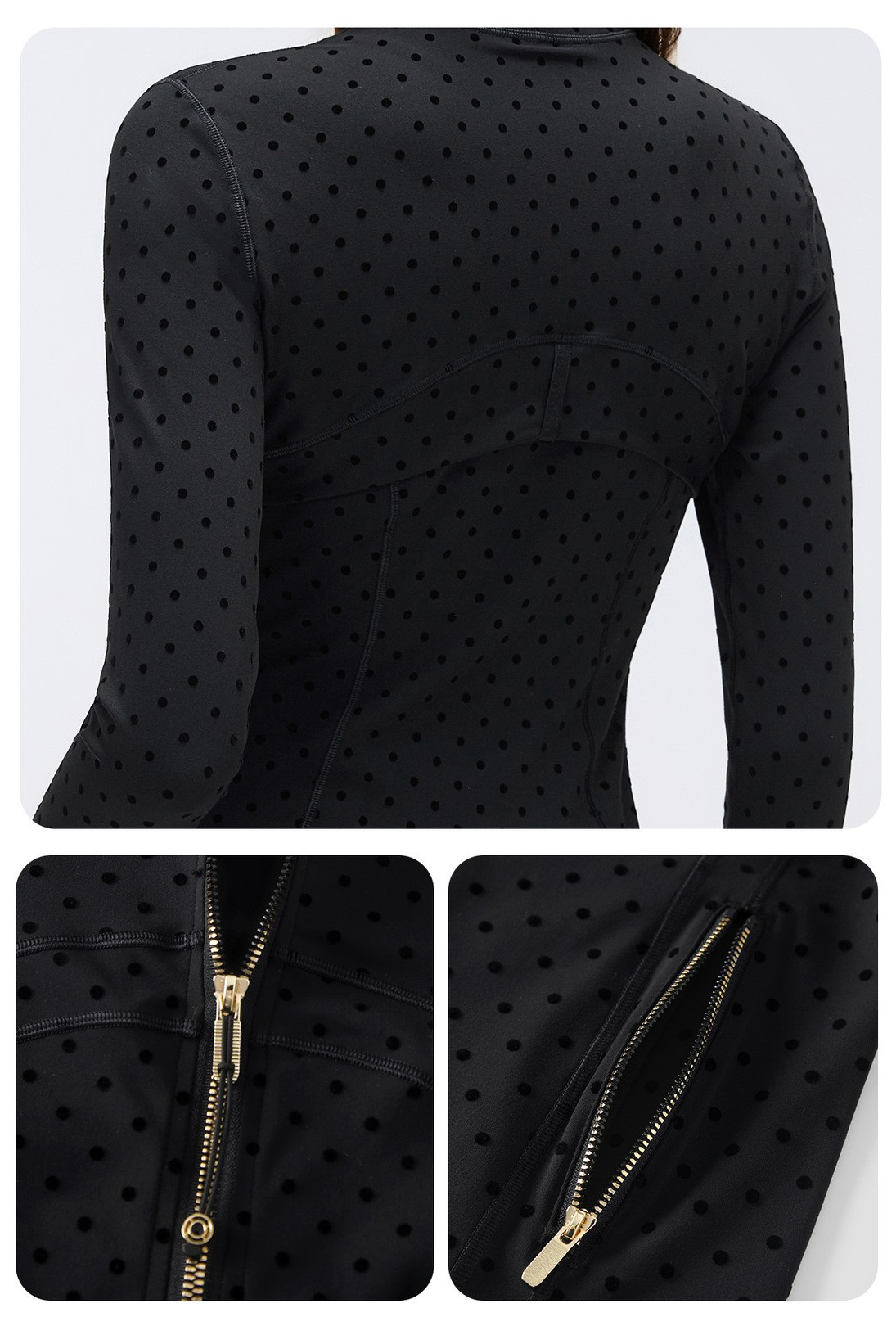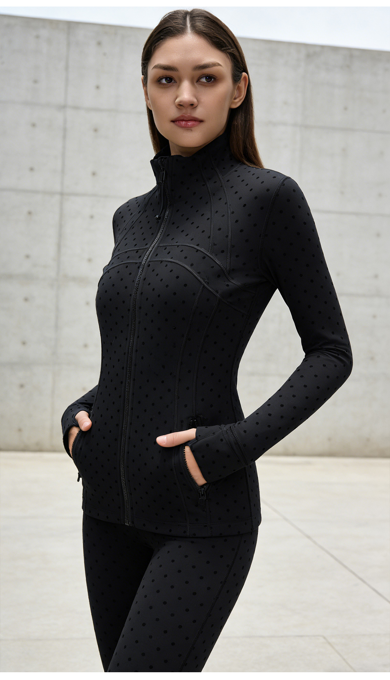 Bulk Custom Yoga Sports Set – Polka Dot Tummy Control Leggings & Slimming Stand Collar Workout Jacket