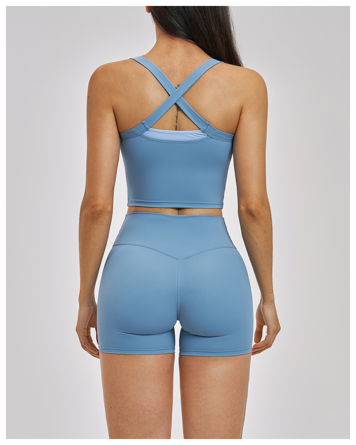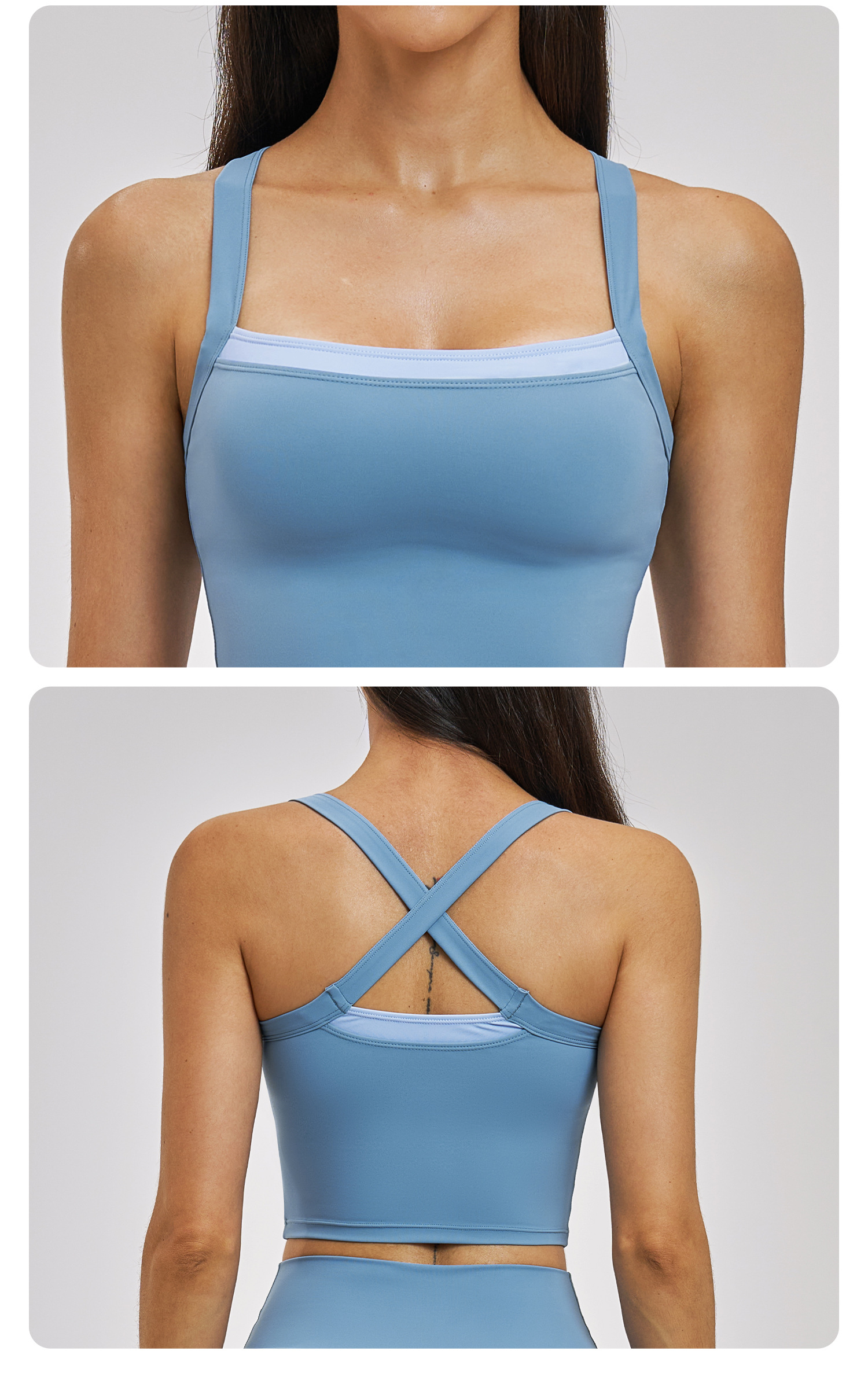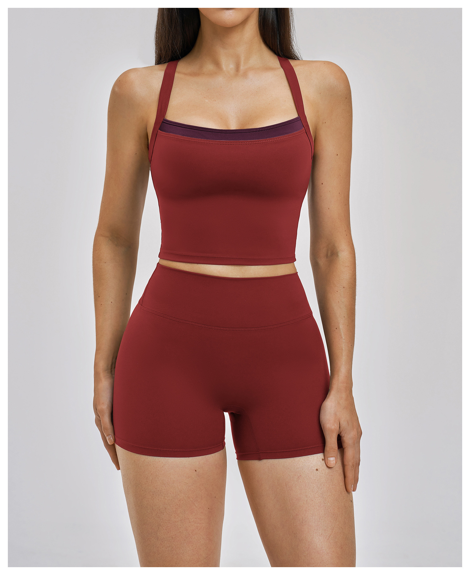 Women’s Fake Two-Piece Yoga Tank Top Set Crisscross Beauty Back Color Block Sports Shorts Active Wear: This women’s fake two-piece yoga set features color block design and crisscross beauty back tank top with matching sport shorts. High-stretch, breathable and moisture-wicking fabric ensures comfort for yoga, gym, fitness and daily workouts. Stylish color matching and body-shaping cut show your perfect curve. Support custom logo, color and size. Omi Apparel Limited provides bulk customization with stable quality, competitive price and on-time delivery. Ideal for wholesale and brand orders.