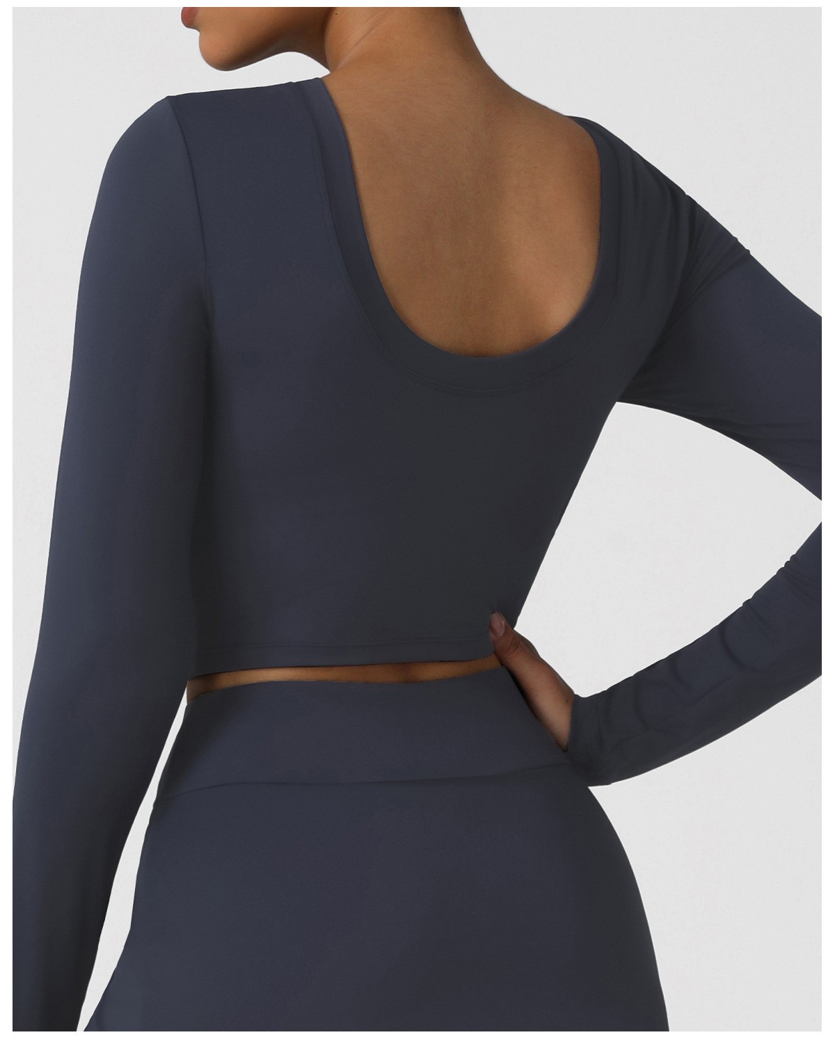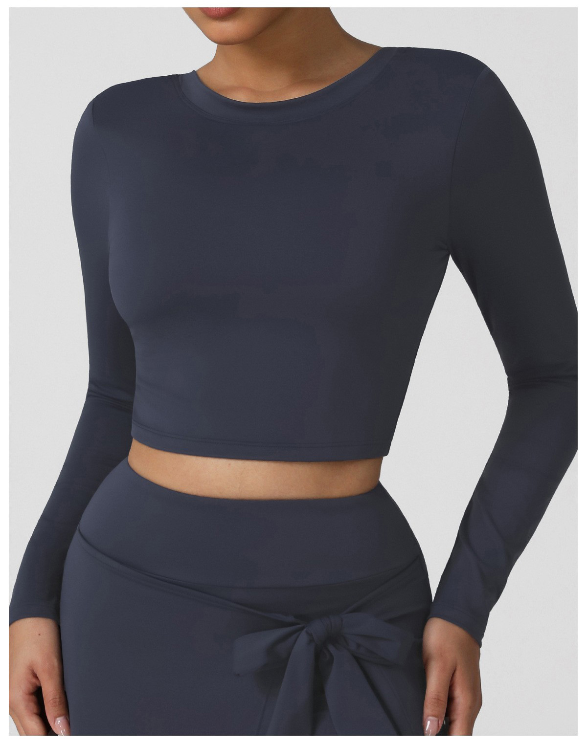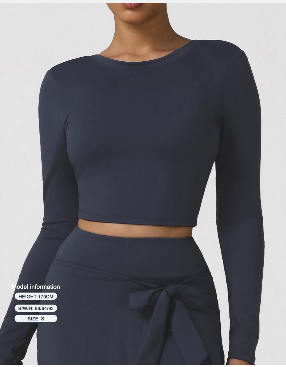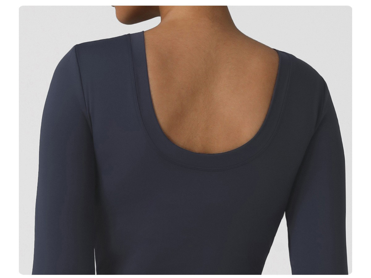 Omi Apparel Limited presents this backless, tight yoga top—sexy yet functional. Long sleeves with built-in pads, perfect for yoga, dance, and workouts. Factory-direct bulk customization available, ensuring quality and affordability. Elevate your fitness look now!