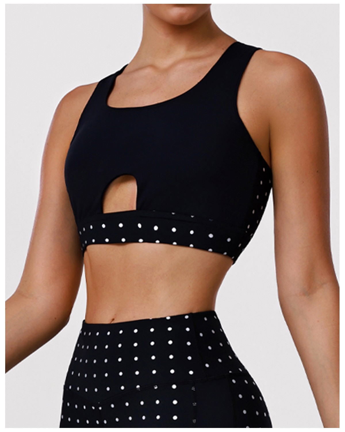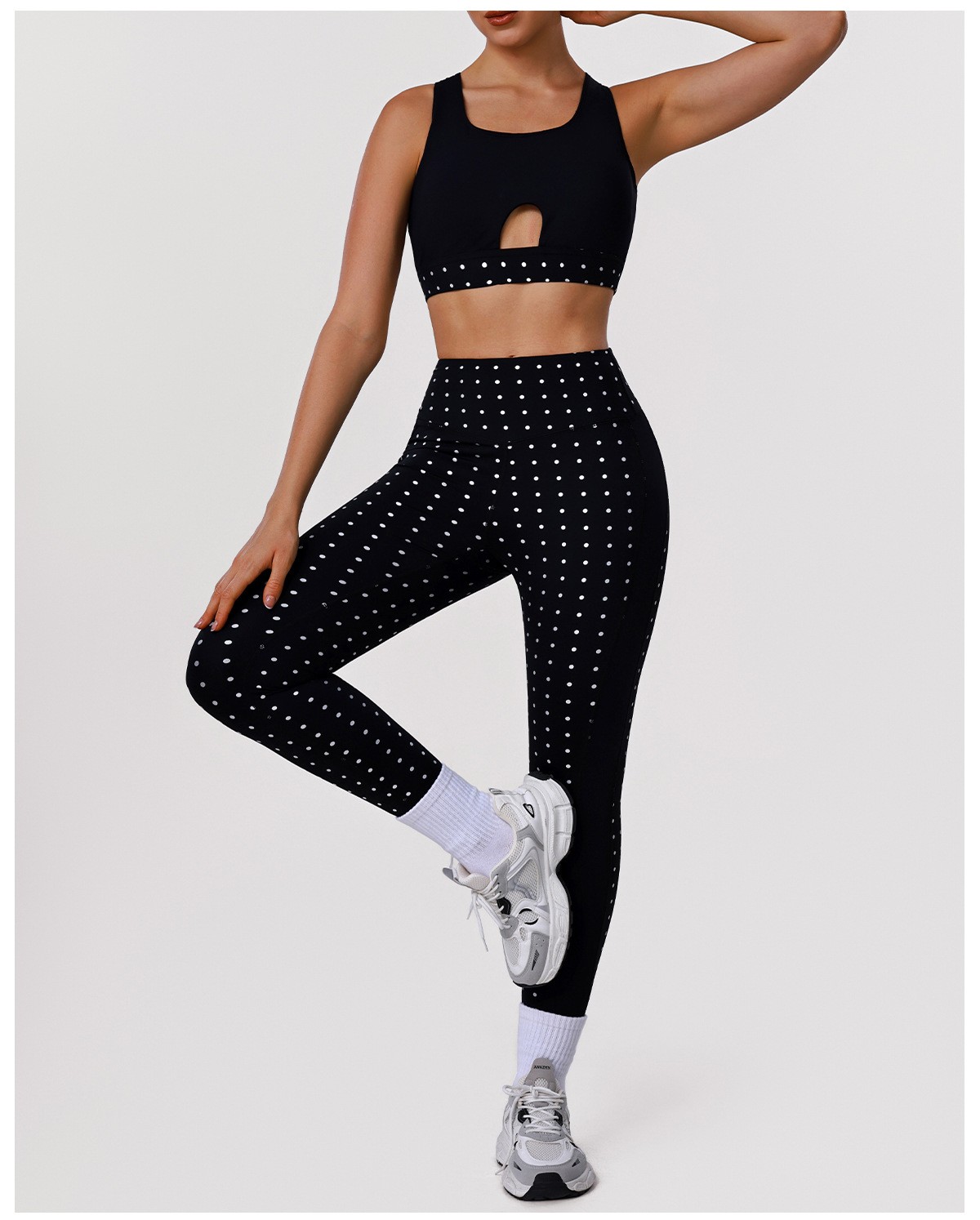 Bulk Custom Polka Dot Activewear Set - Open Back Bra & High-Waisted Tummy Control Yoga Pants: OMI Factory Direct Bulk Custom! This polka dot yoga set blends playful print with pro shaping performance—open back sports bra highlights curves, high-waisted leggings deliver tummy control and butt-lifting effect. Crafted from 4-way stretch moisture-wicking fabric, it’s perfect for yoga, running and gym training. Support custom polka dot sizes, logos and plus sizes up to 5XL with flexible MOQ—ideal for activewear wholesale!