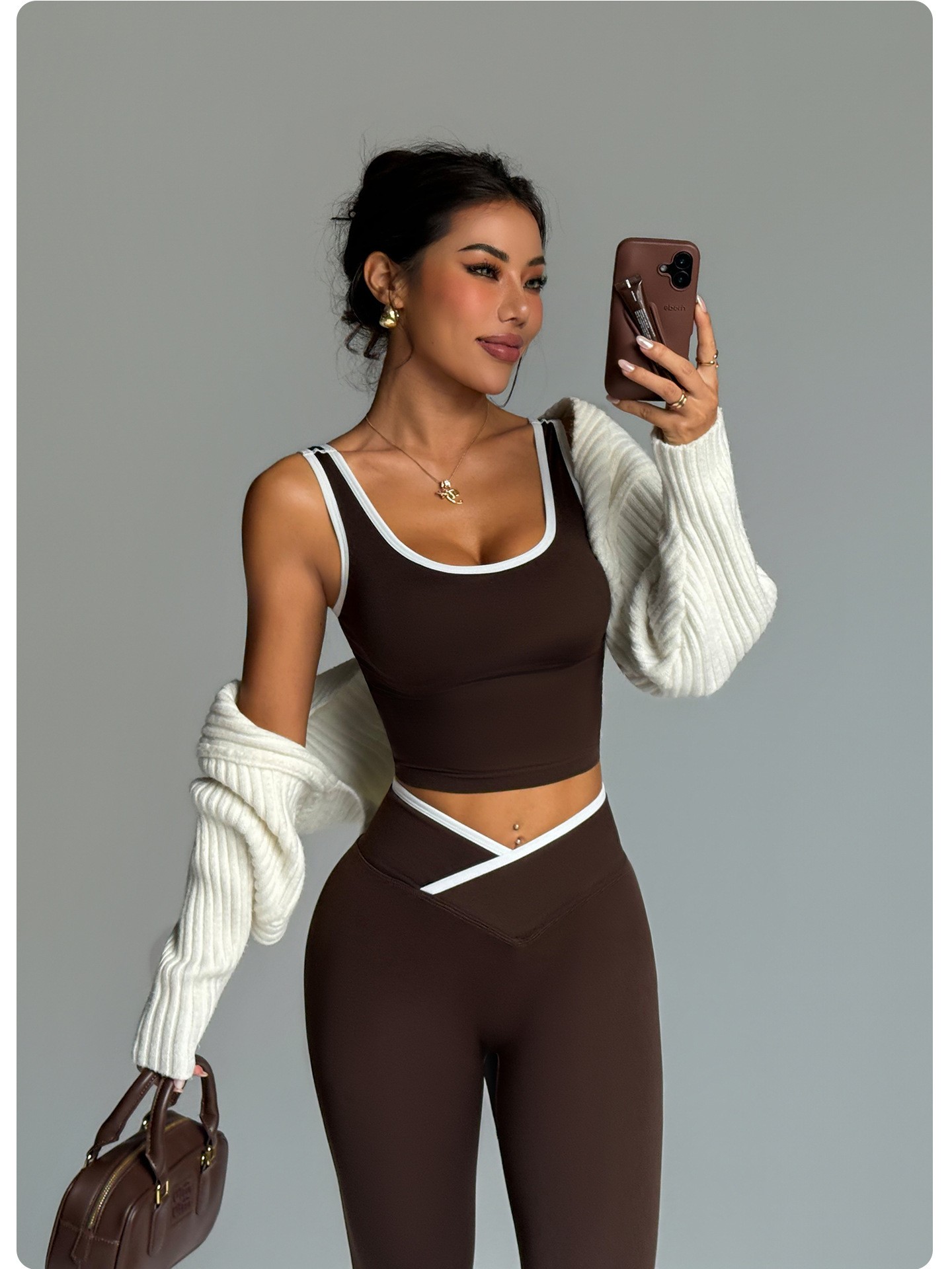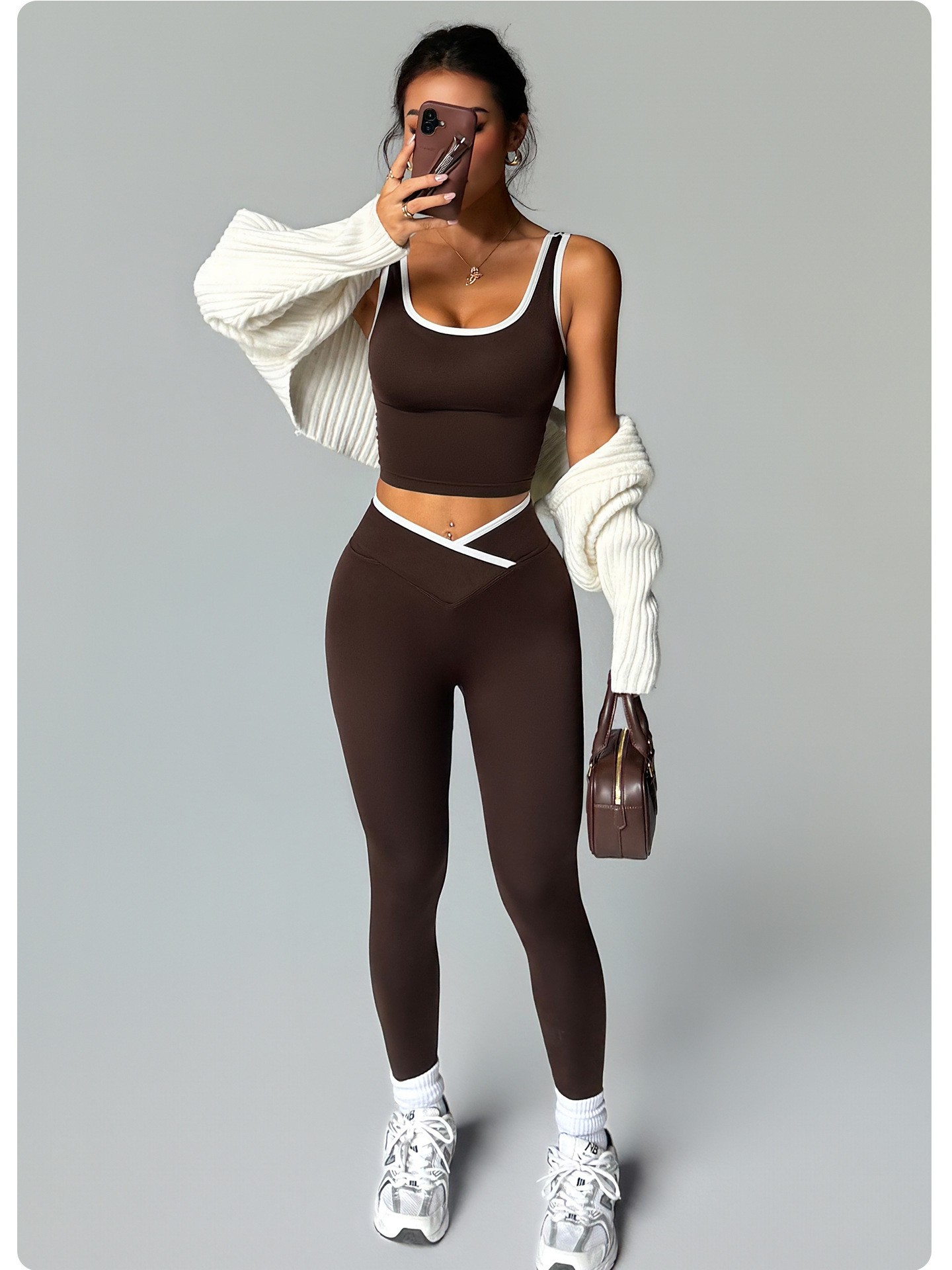 Custom Tight Yoga Fitness Set – Color Block Cross High-Waist Sports Bra & Leggings Workout Wear