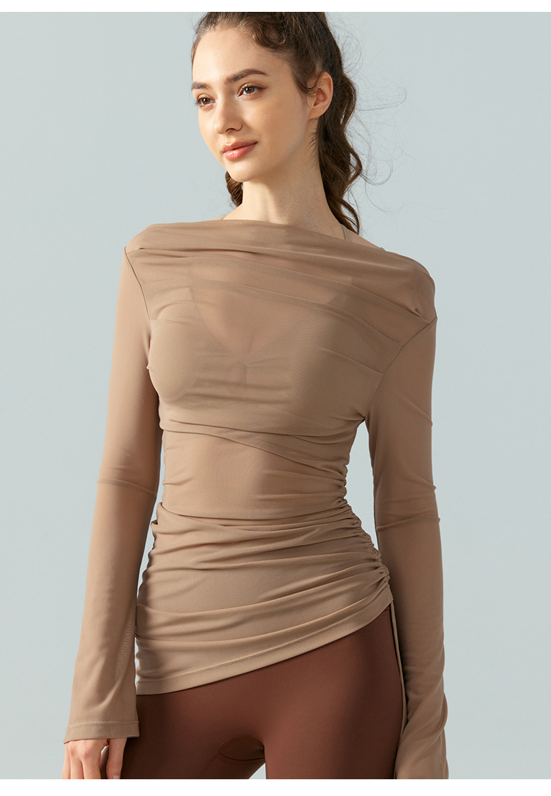 Custom women loose long sleeve mesh tshirt side drawstring sports smock Factory Low MOQ