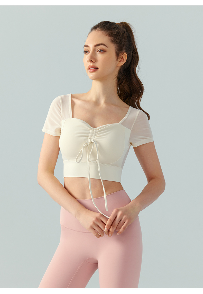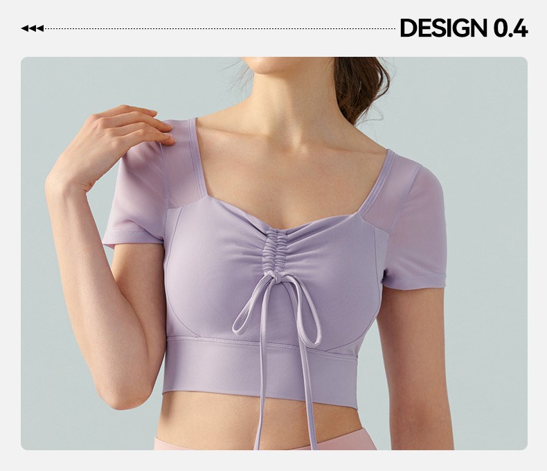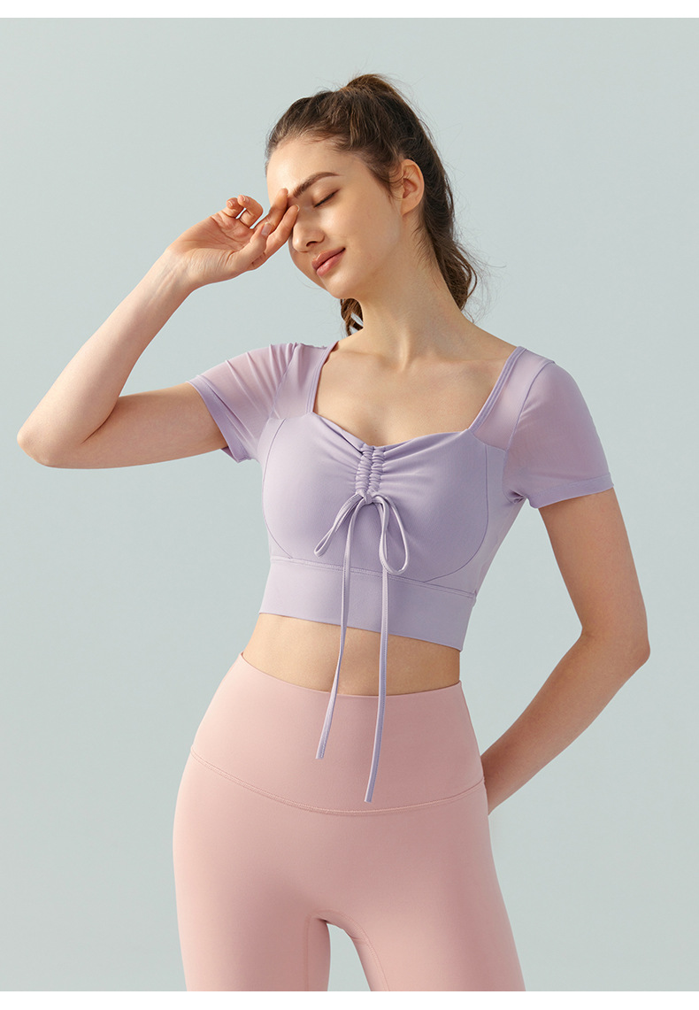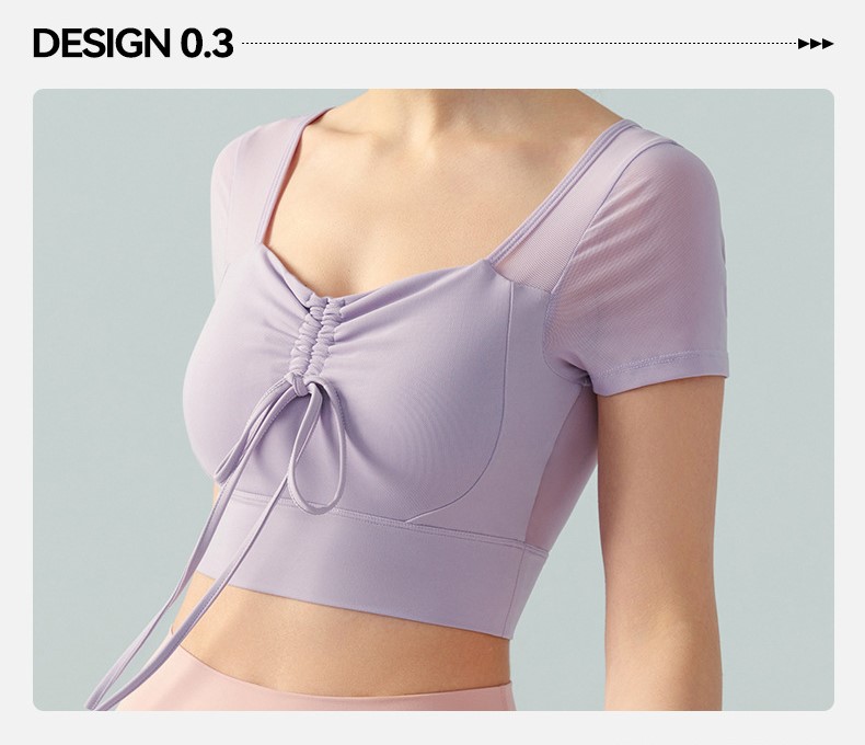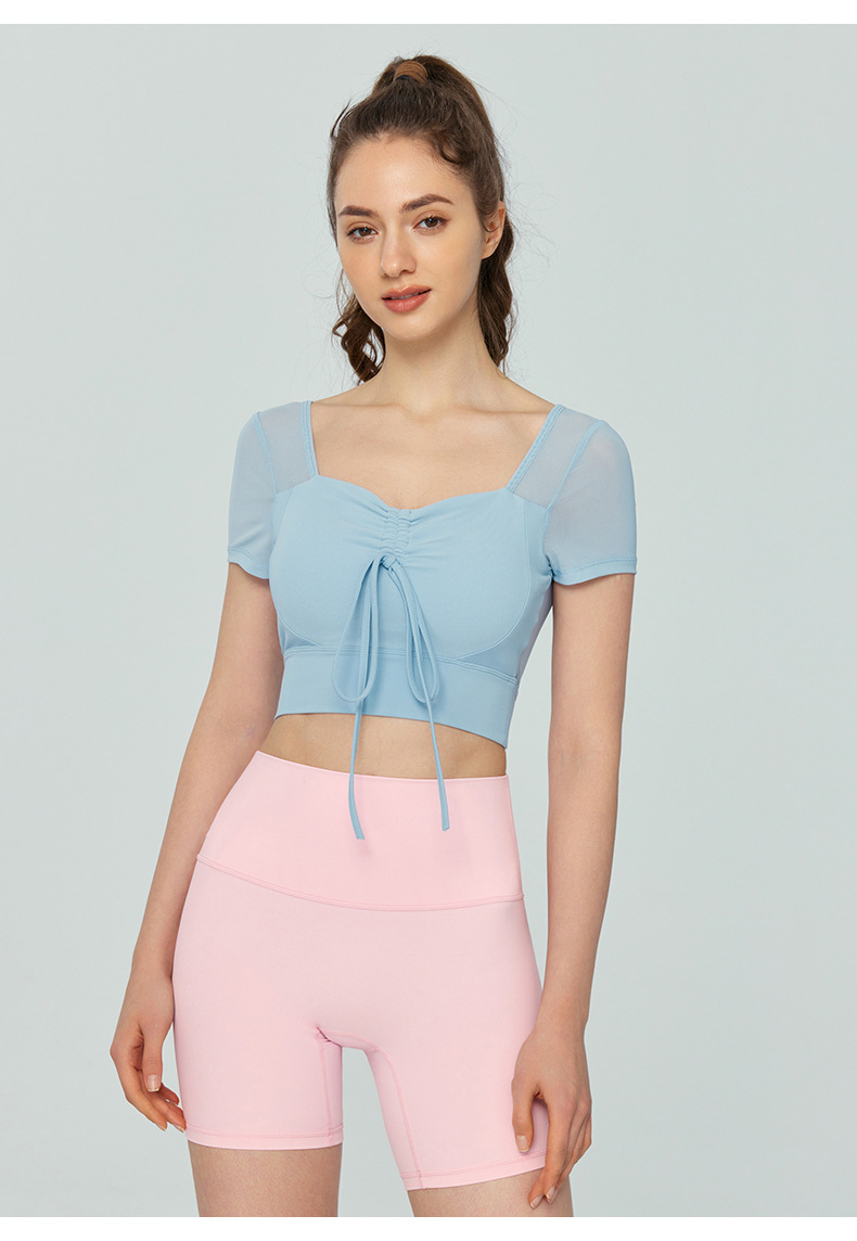 Custom women yoga short sleeve t-shirt padded pleats drawstring crop top OEM Low MOQ