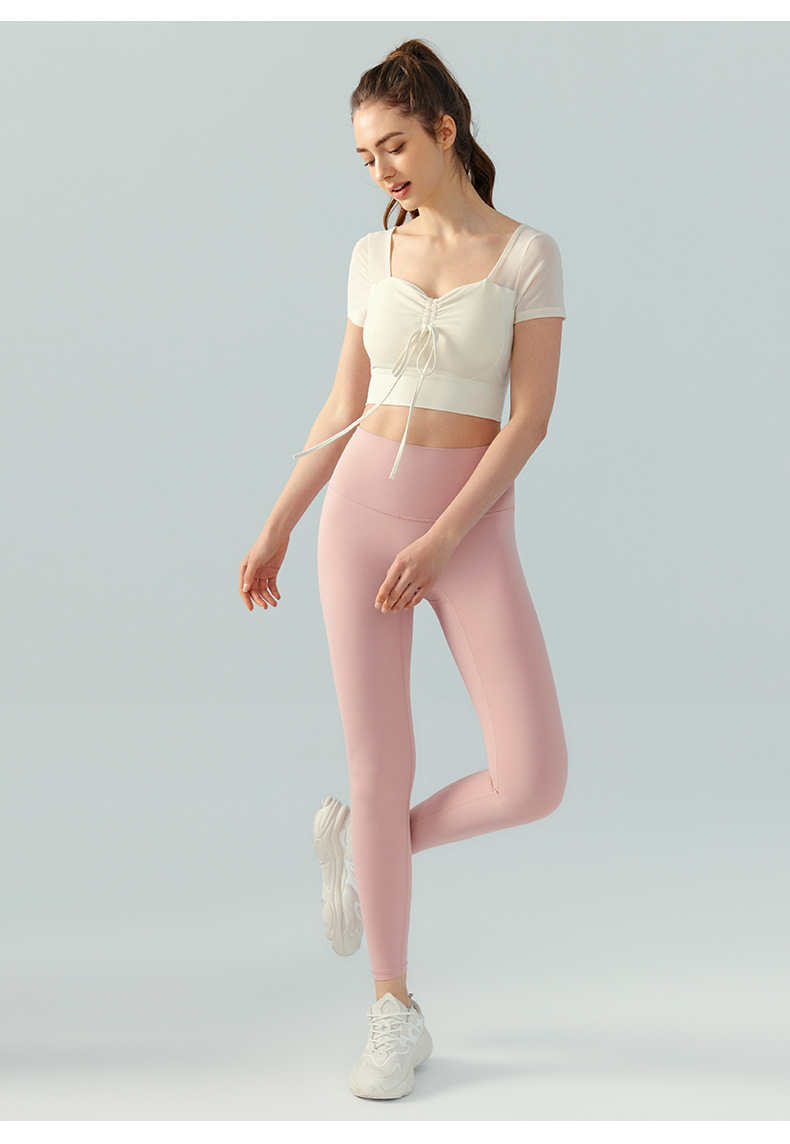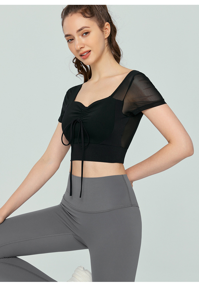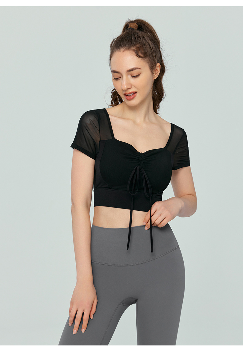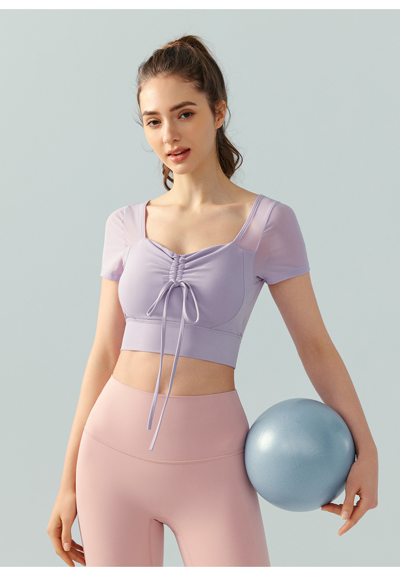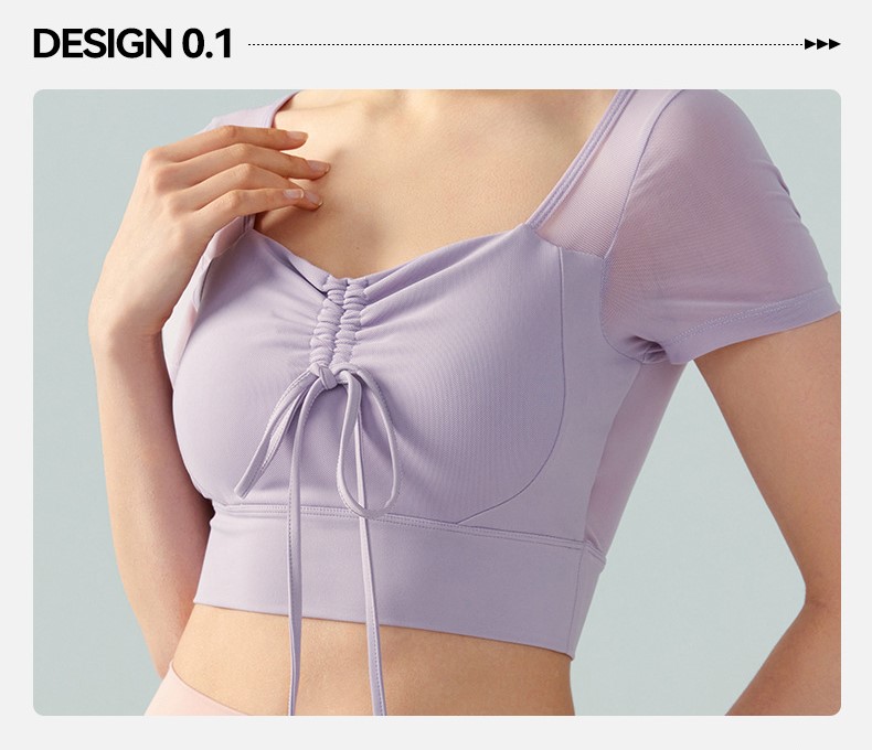 Custom women yoga short sleeve t-shirt padded pleats drawstring crop top OEM Low MOQ
