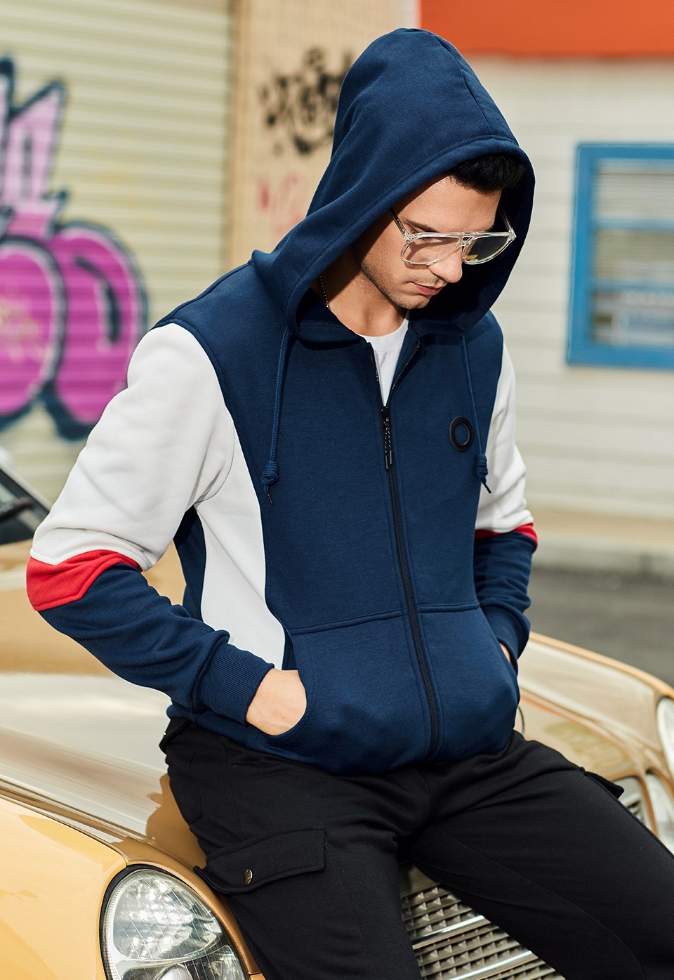 Mens full zip hoodies color block fashion drawstring hooded casual sports sweatshirts tunics