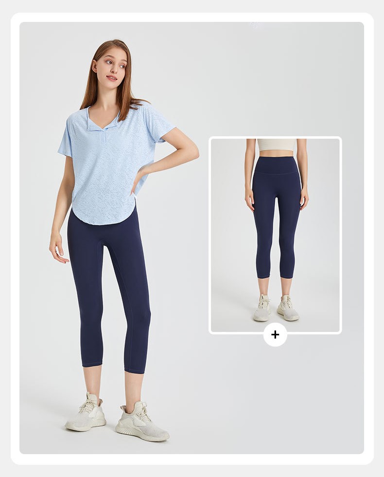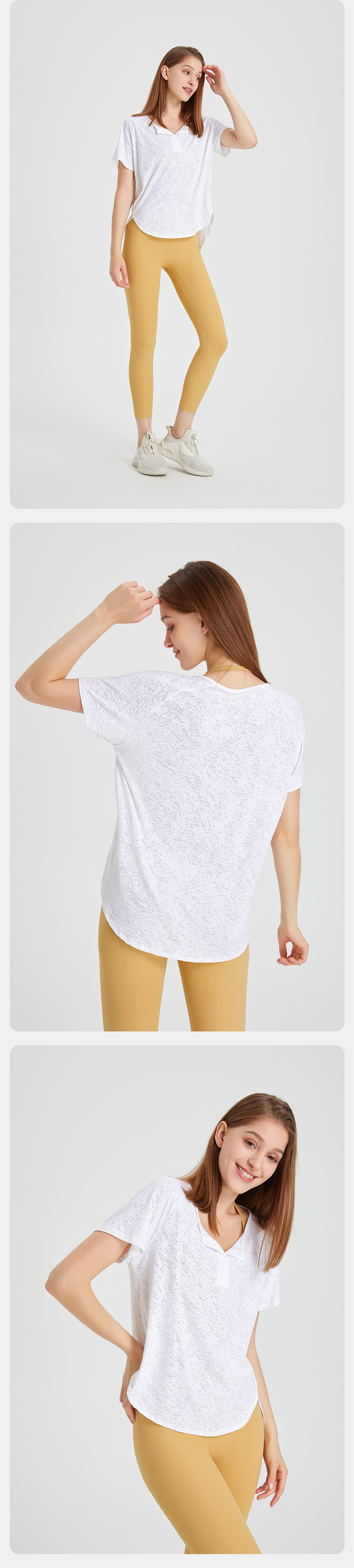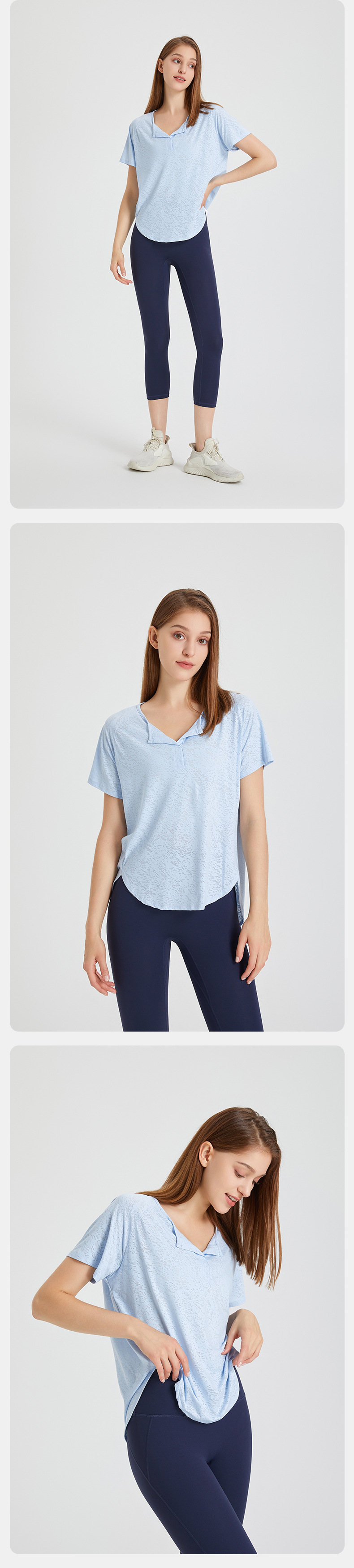 Women loose breathable V neck yoga wear short sleeve t shirt snow jacquard running fitness tee top