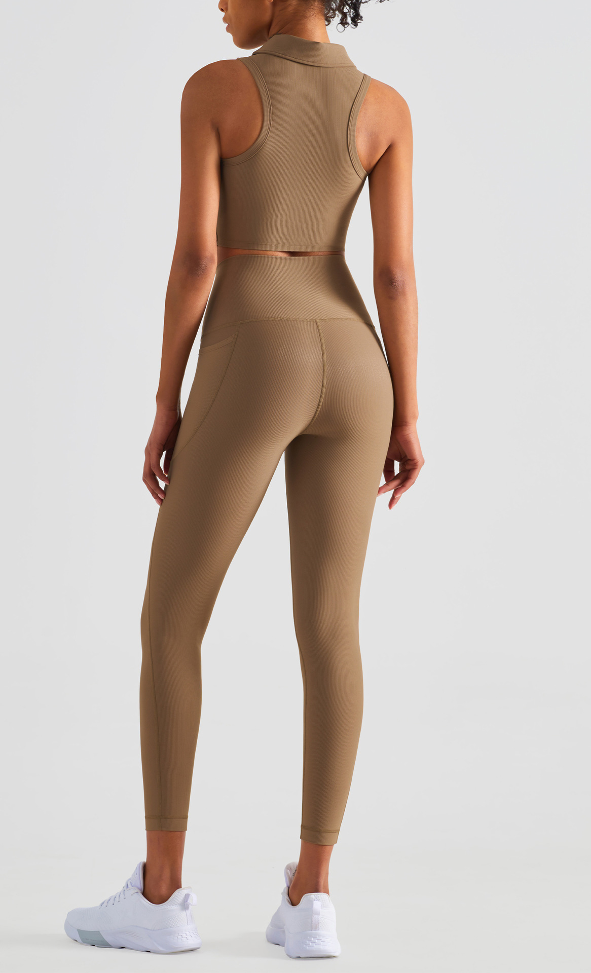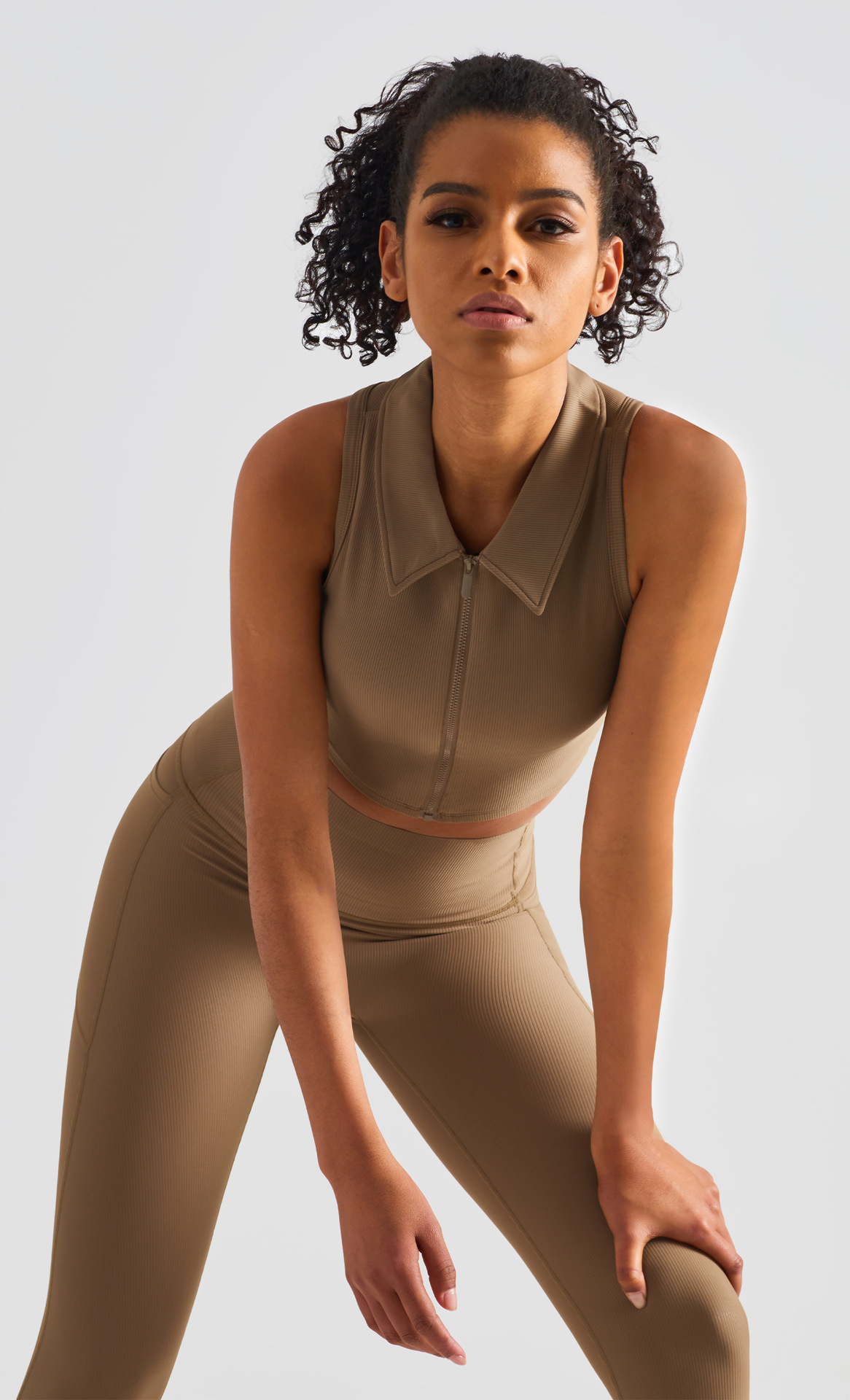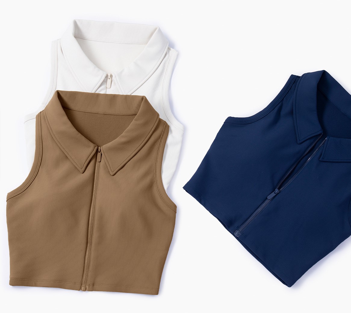Women rib lapel zip tank top outdoor sleeveless tennis fitness workout running athletic crop tops