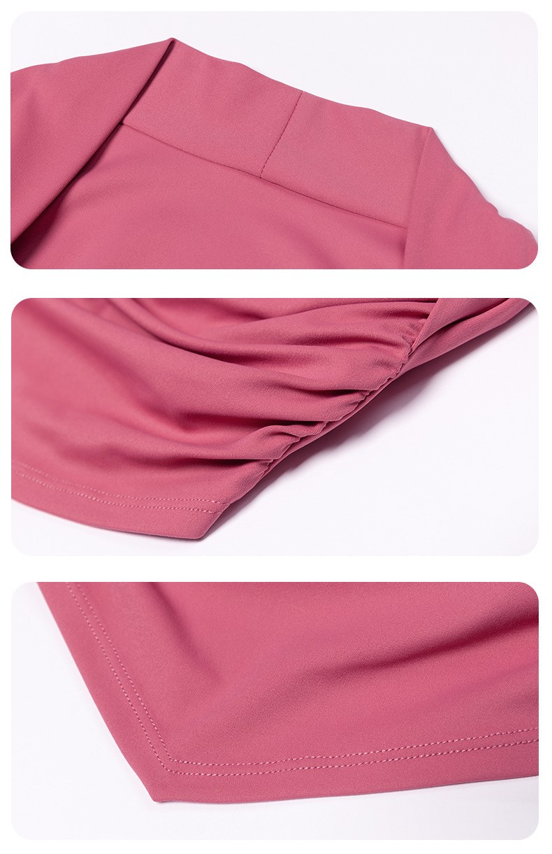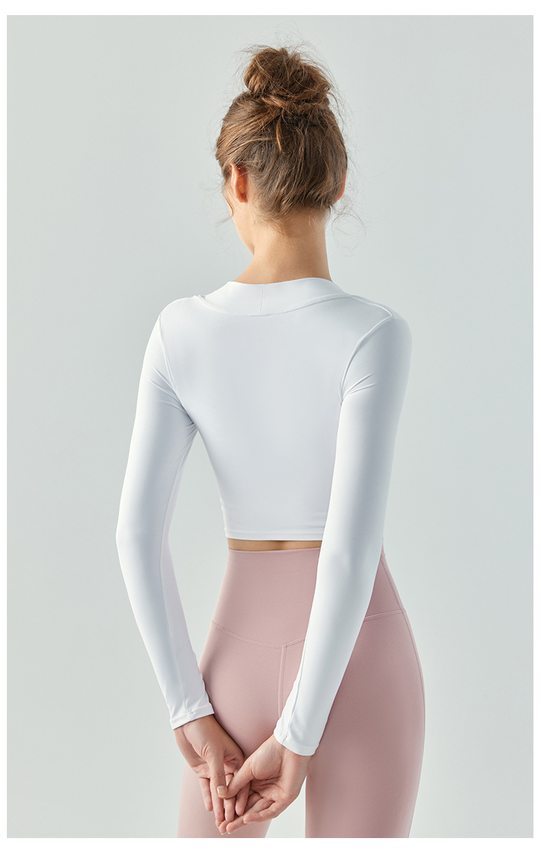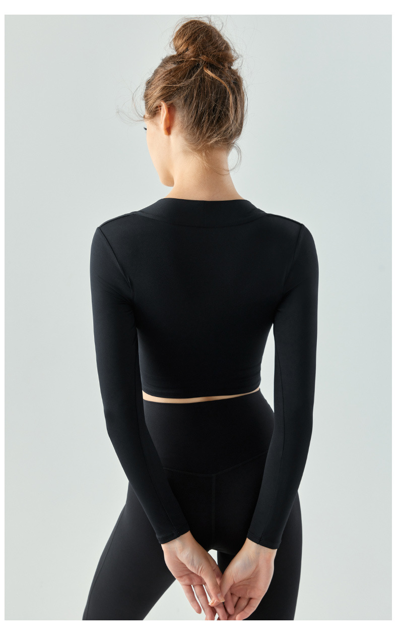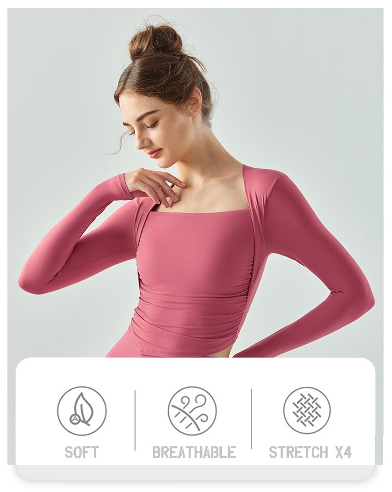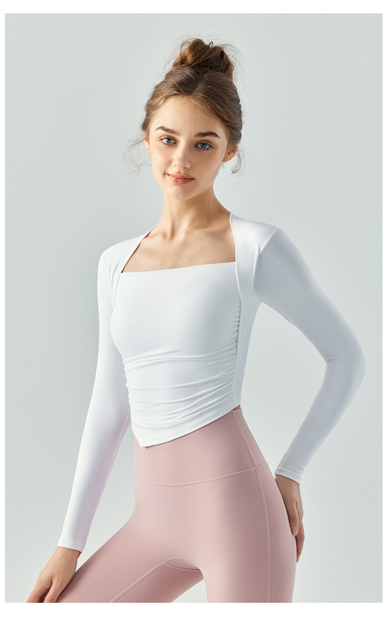 Women U neck pleat yoga long sleeve sweatshirts padded fitness gym workout slim fit crop top