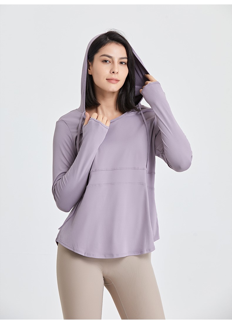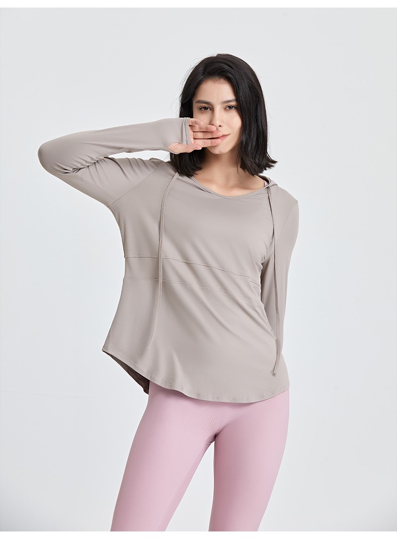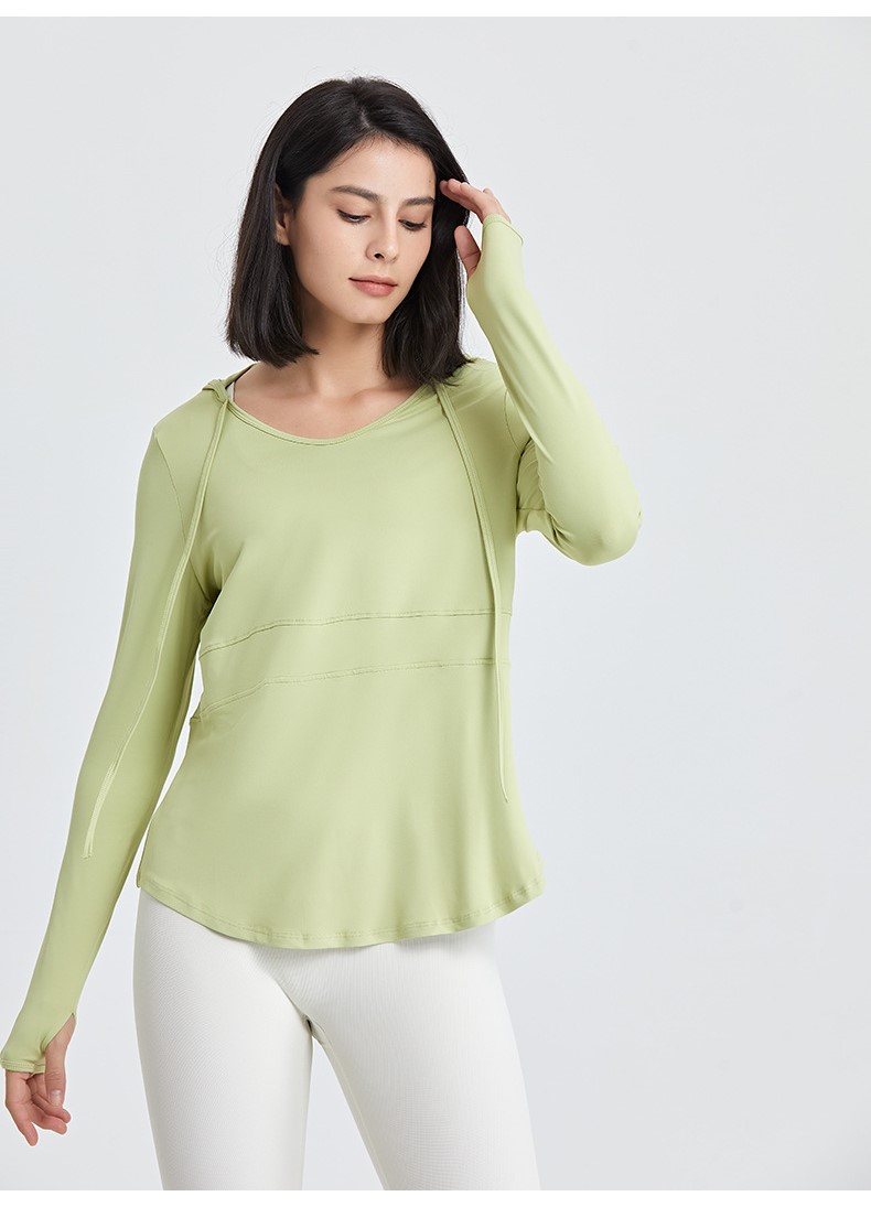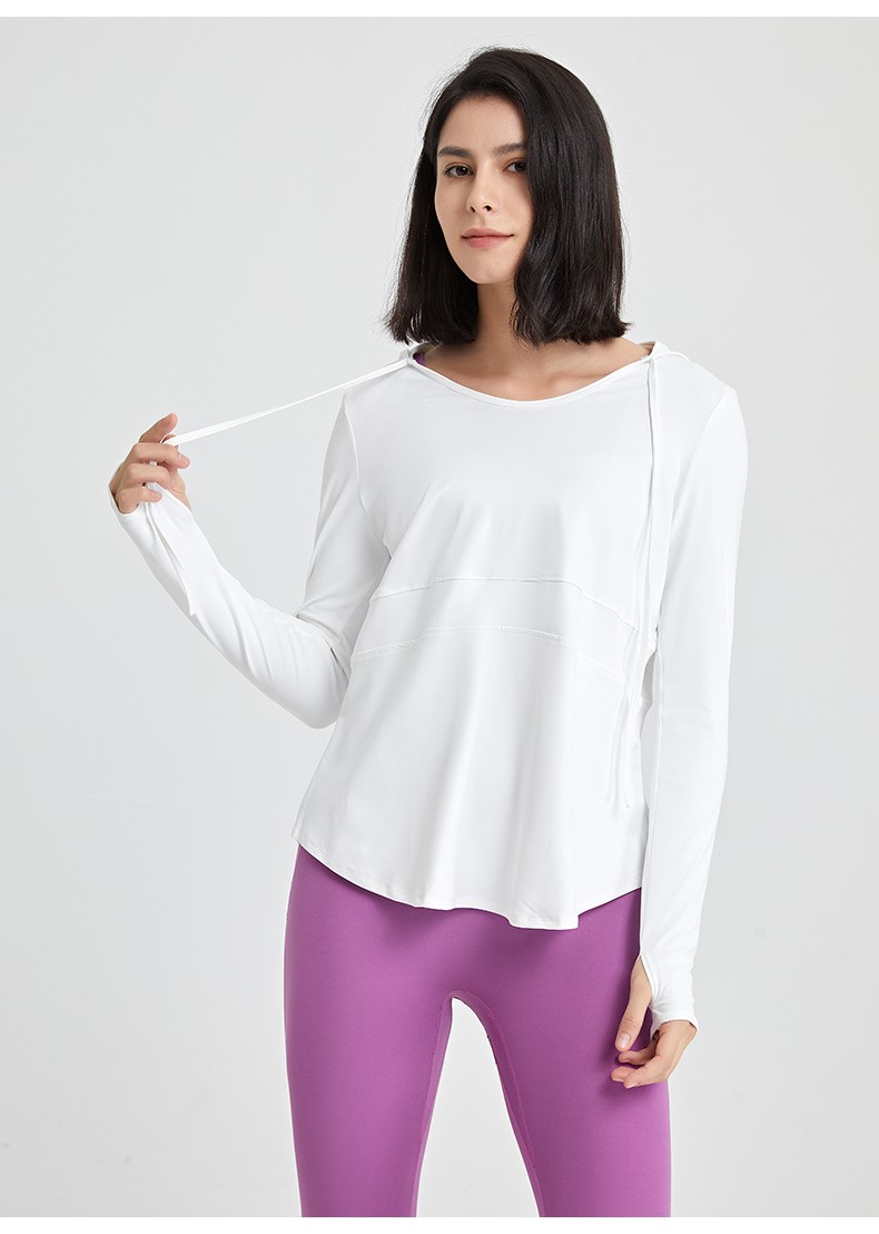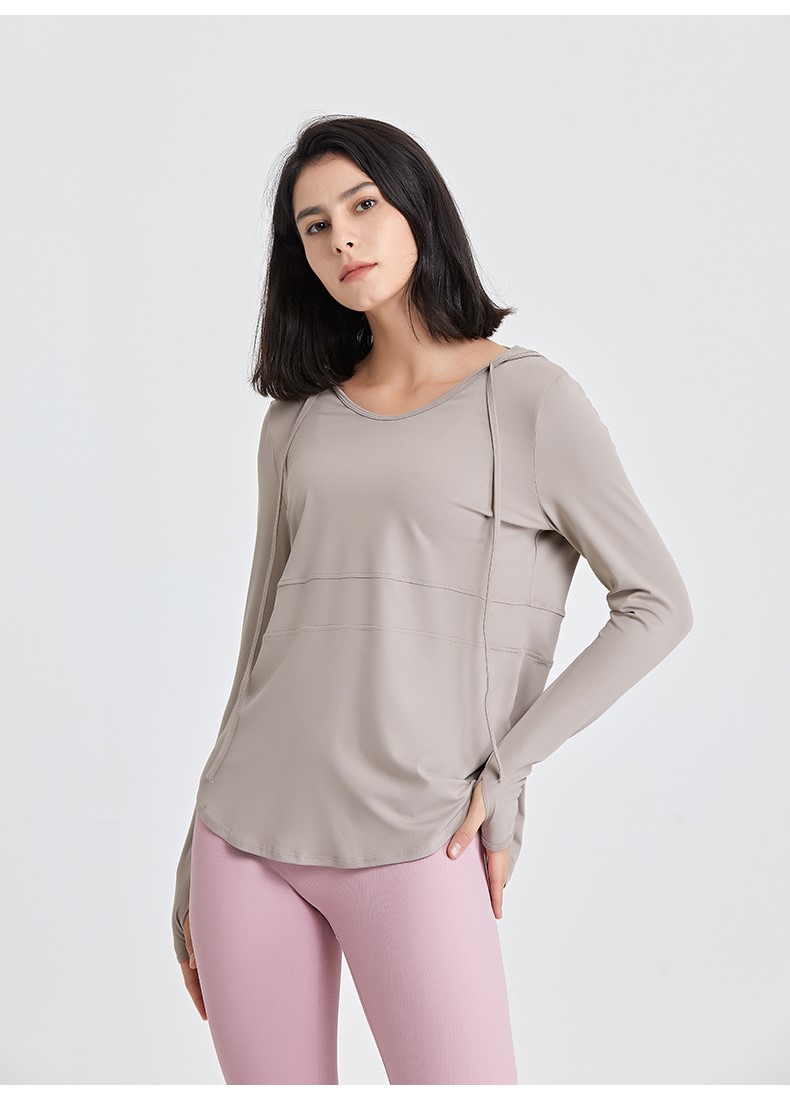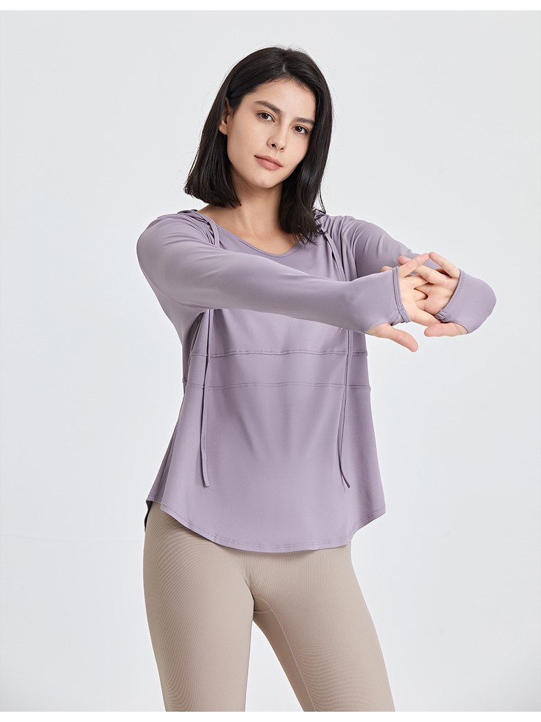 Women v neck loose breathable long sleeve tshirt hooded drawstring running top with finger hole