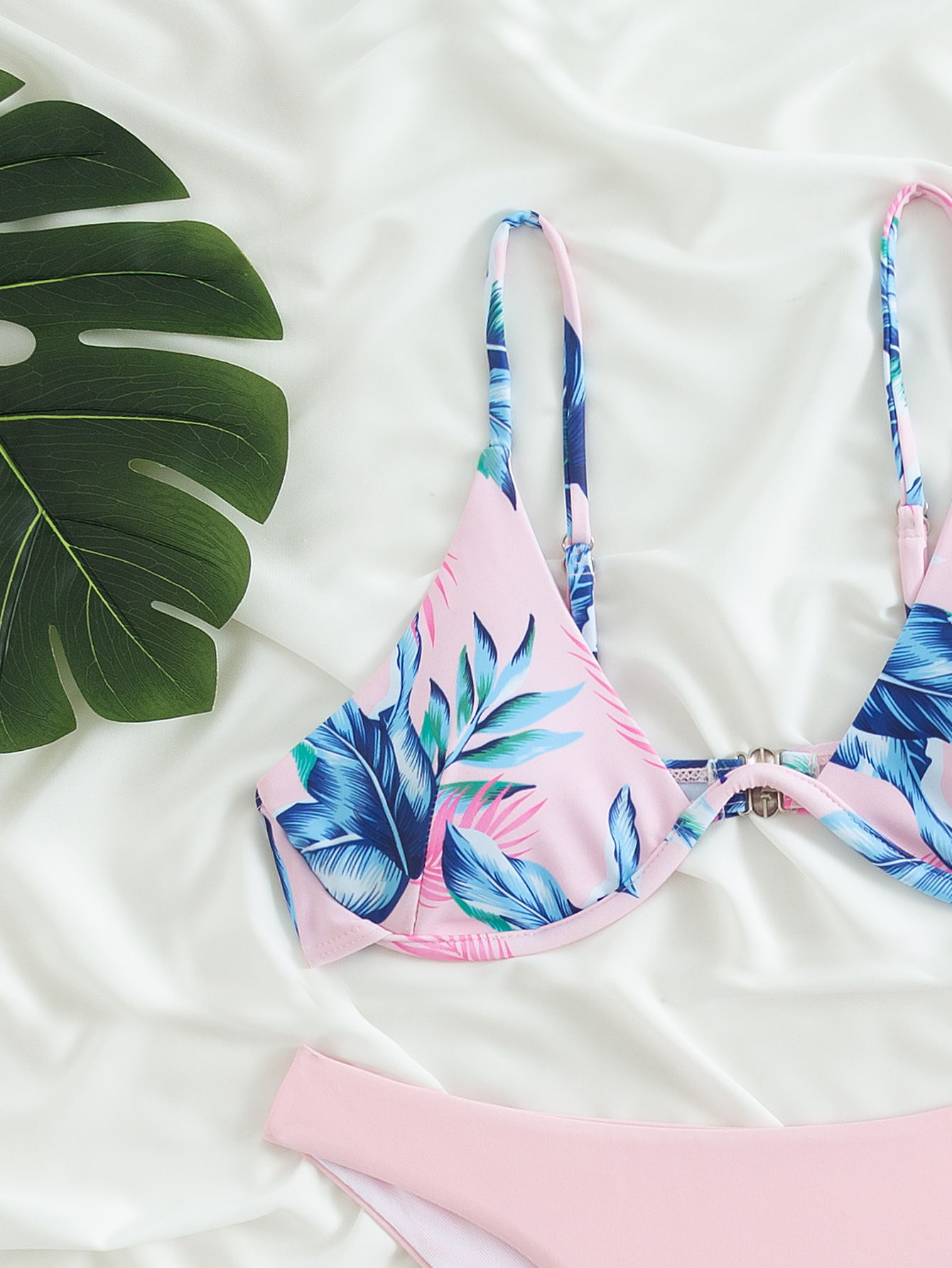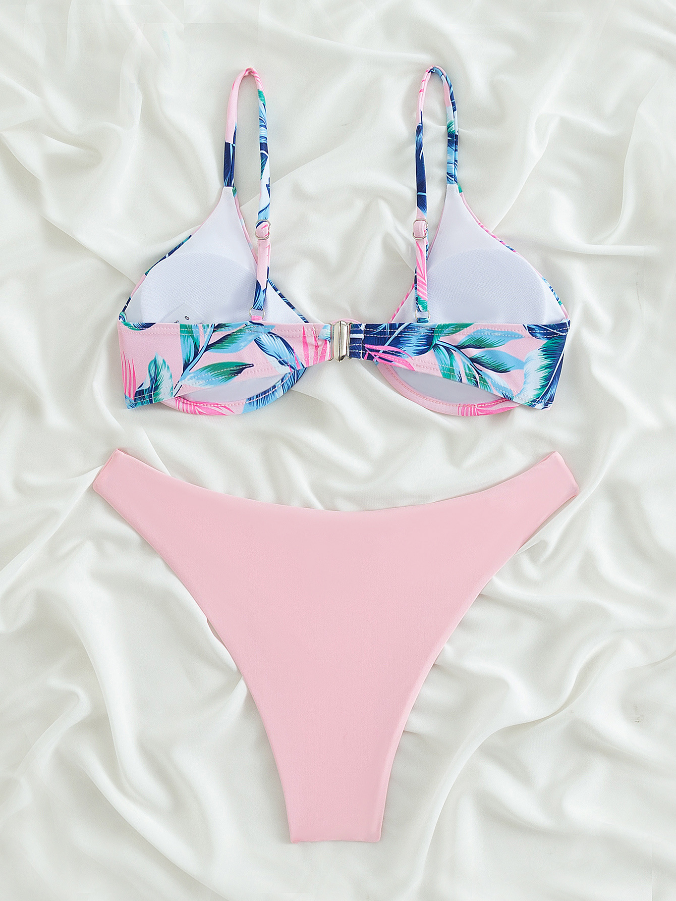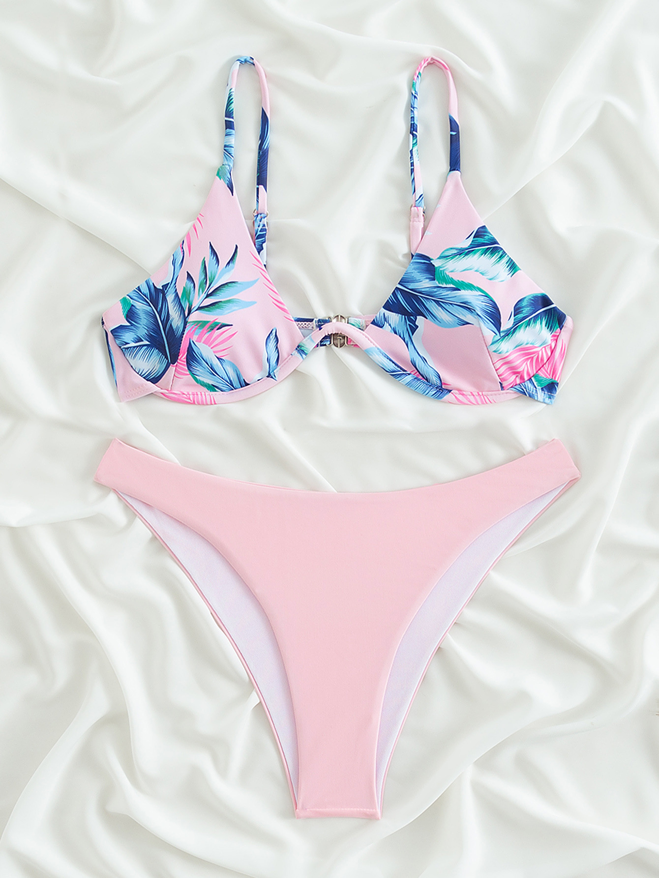 Womens bikini set printed spaghetti straps swim top solid high cut triangle two piece swimsuits
