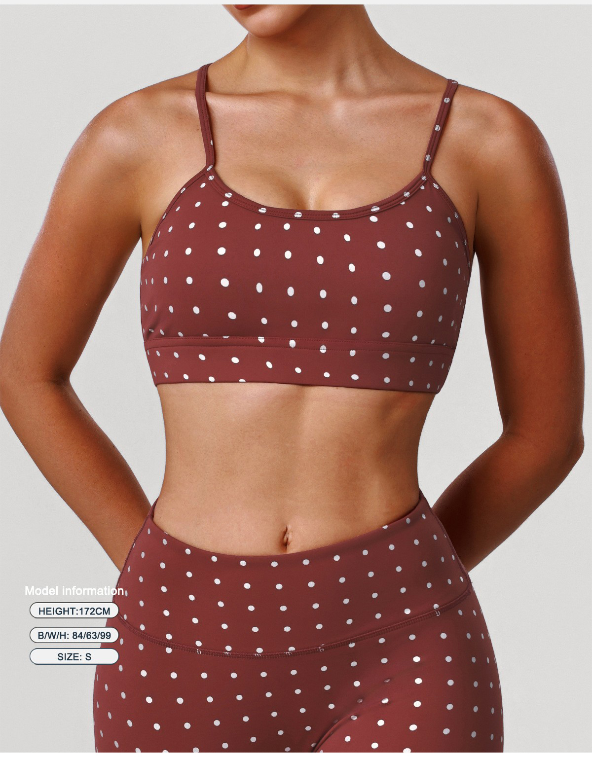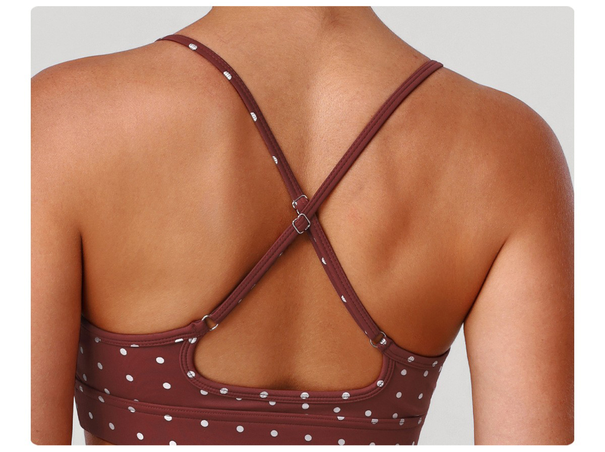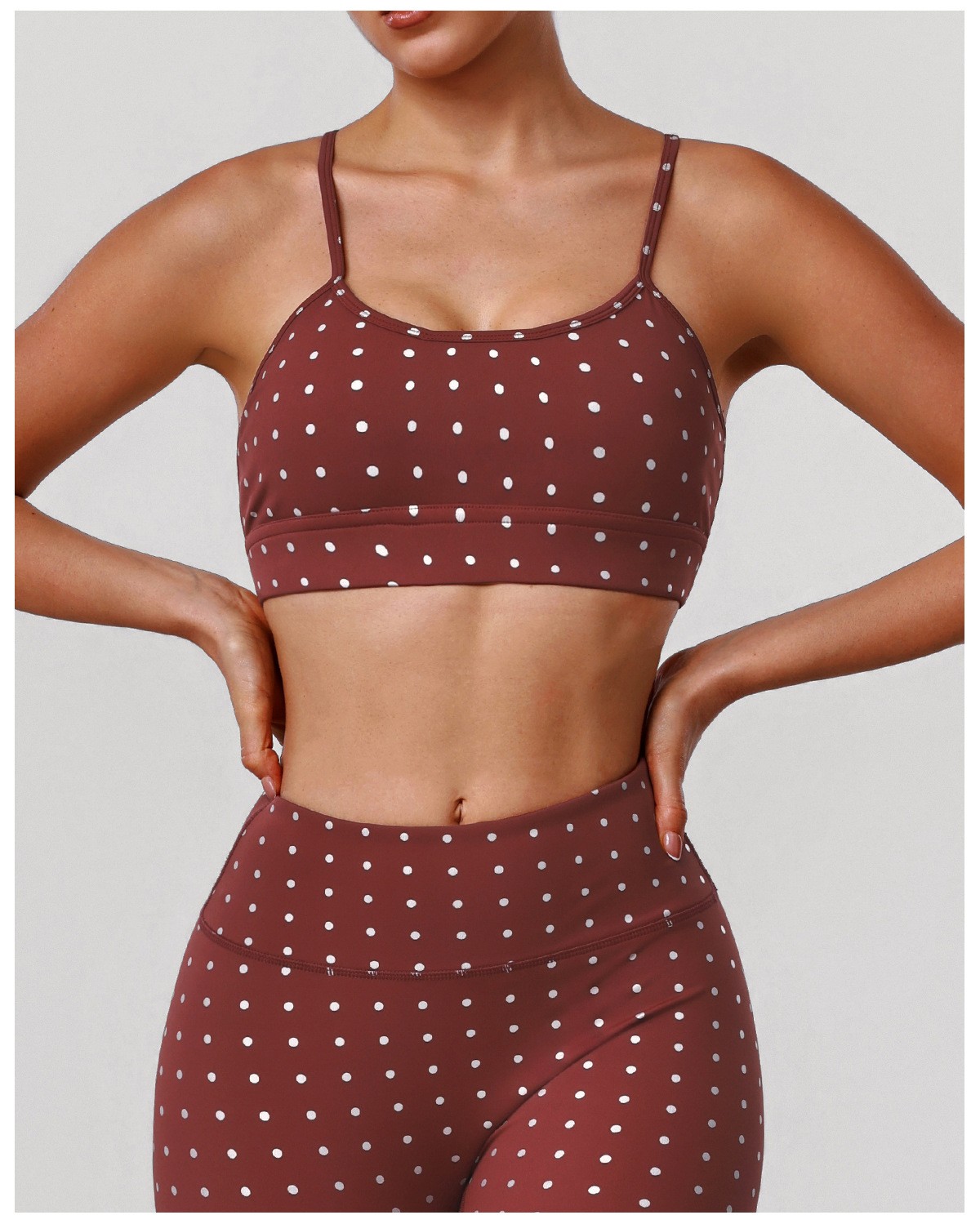 Women’s Customizable US/EU Shockproof Sports Bra – Silver Hot-Stamped Polka Dot Thin Strap High-Elastic Yoga Fitness Bra