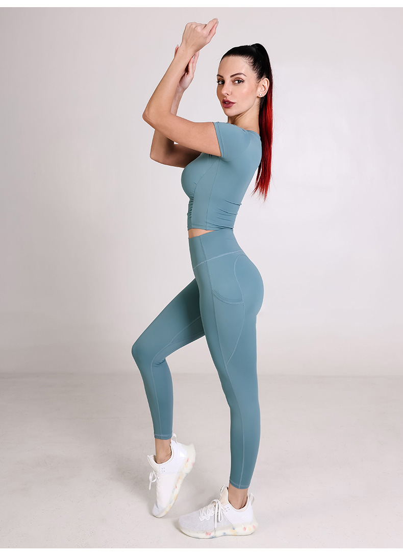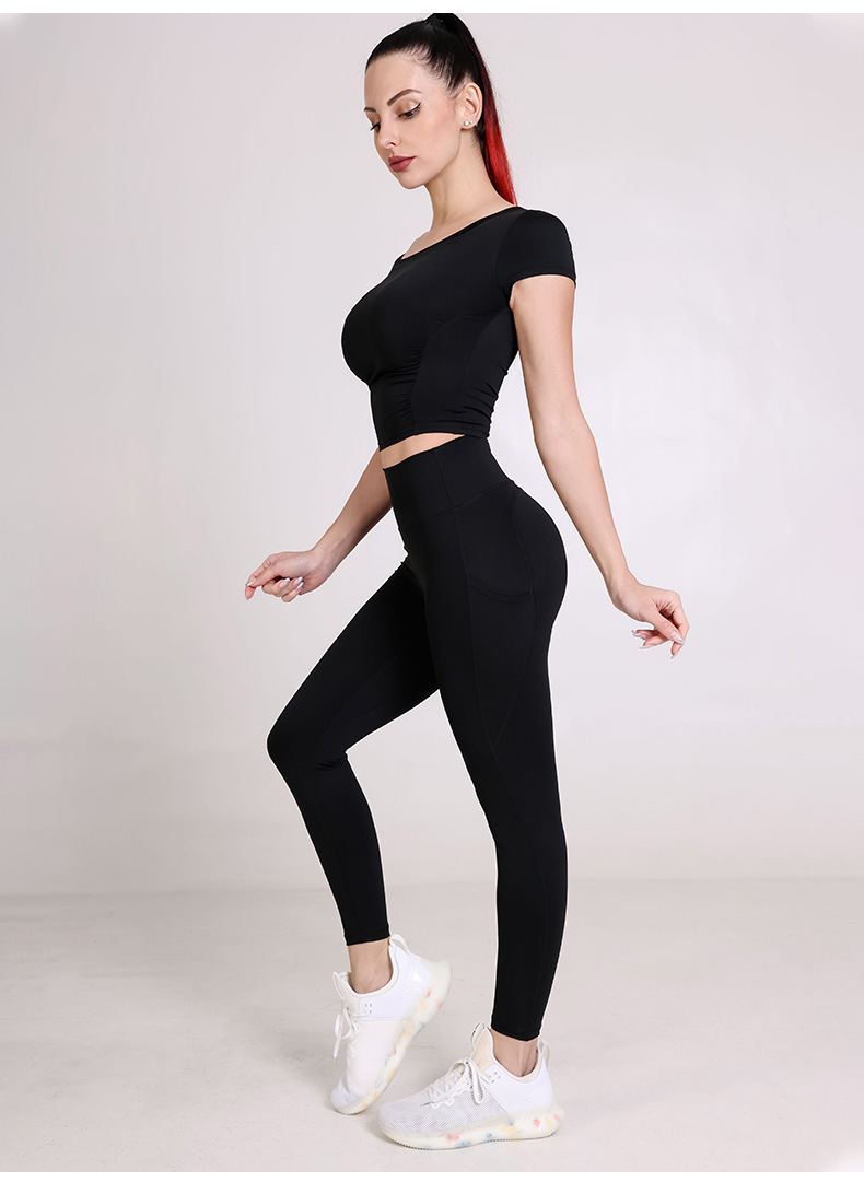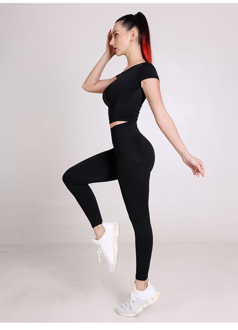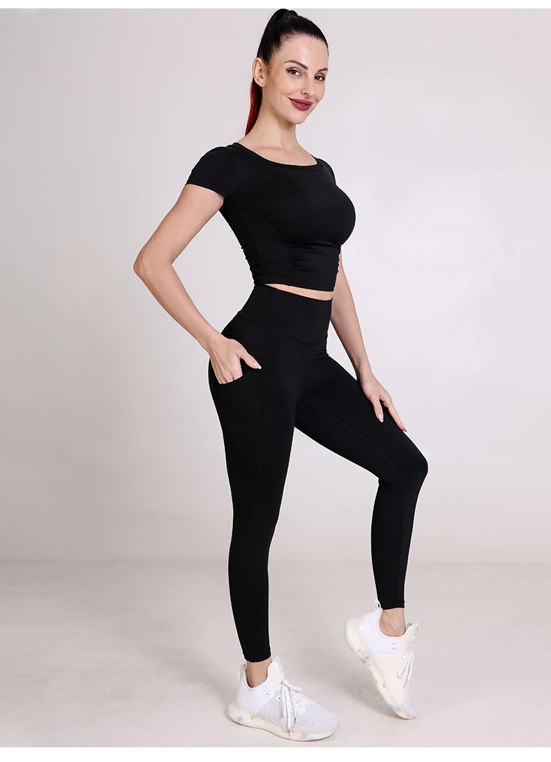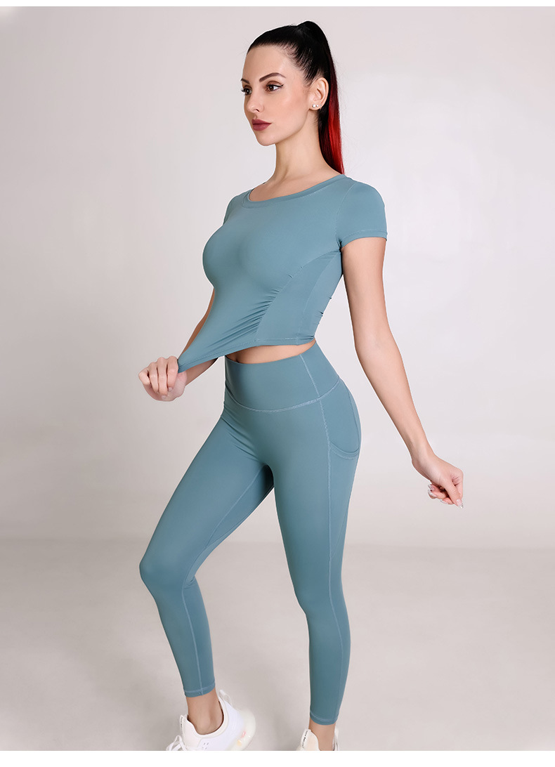 Womens fold padded shorts sleeve yoga T-shirts pockets fitness workout leggings activewear