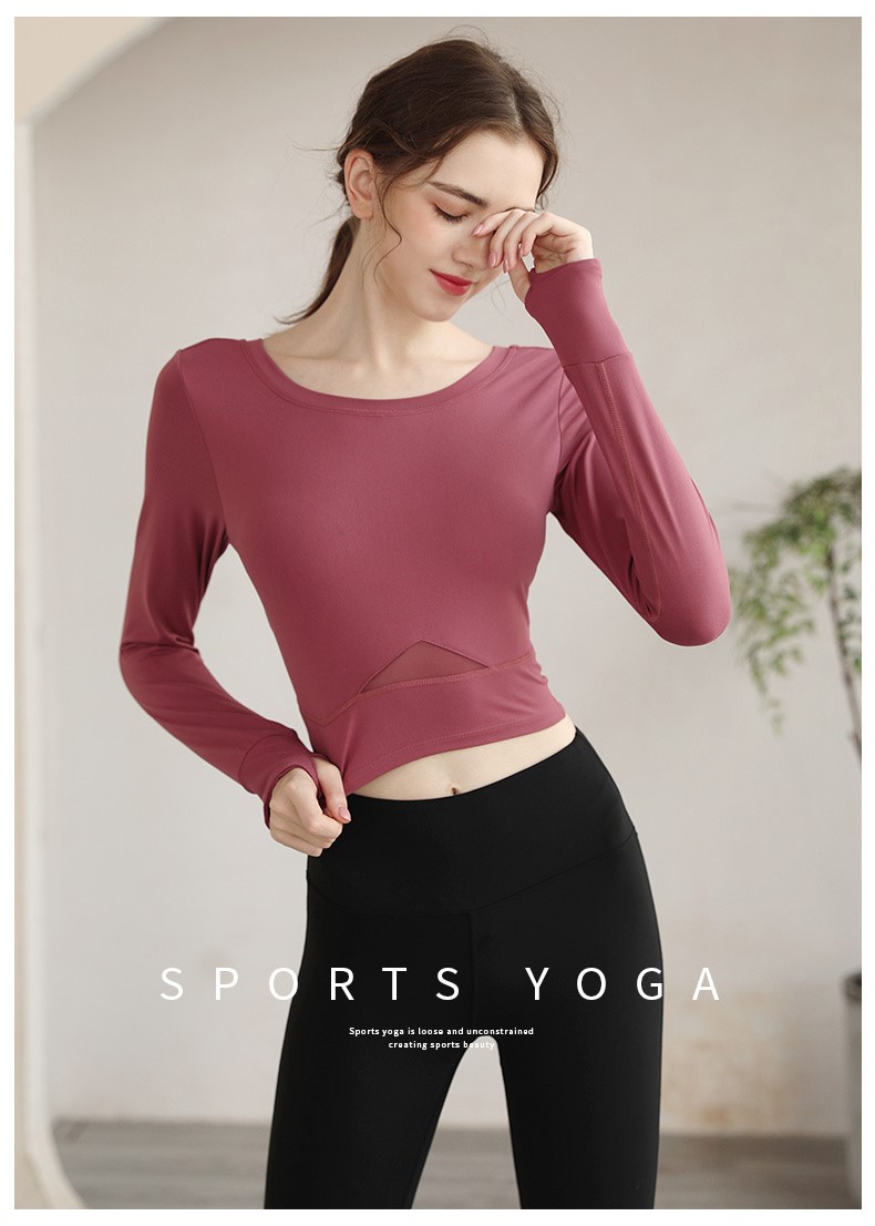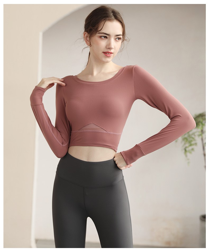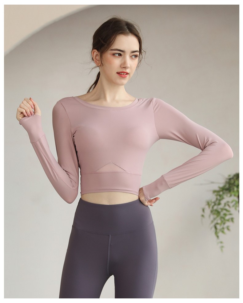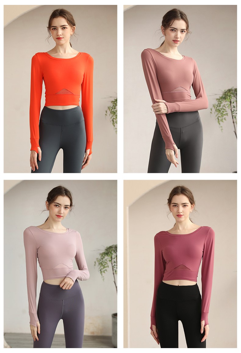 Womens long sleeve crop top U neck mesh fitness yoga padded workout tshirt with thumb hole