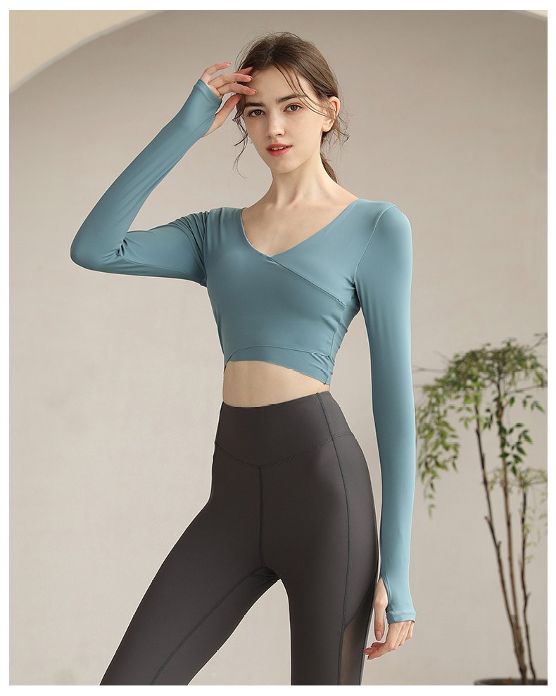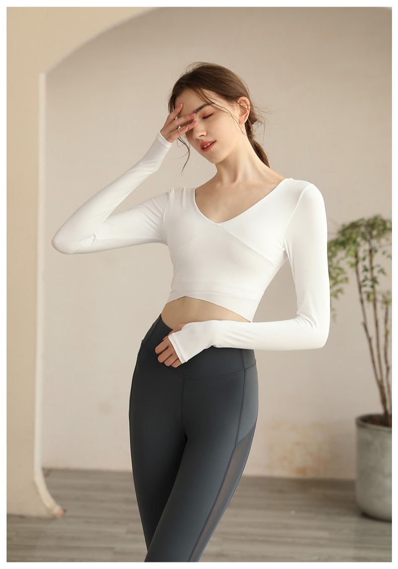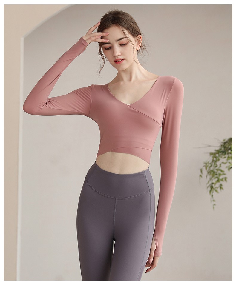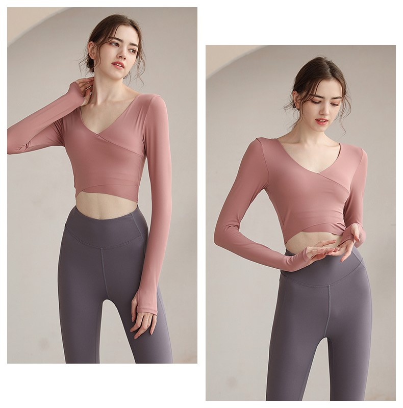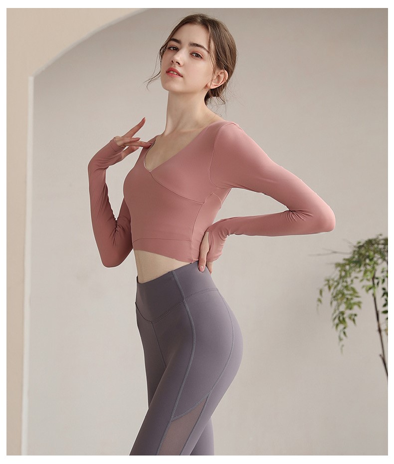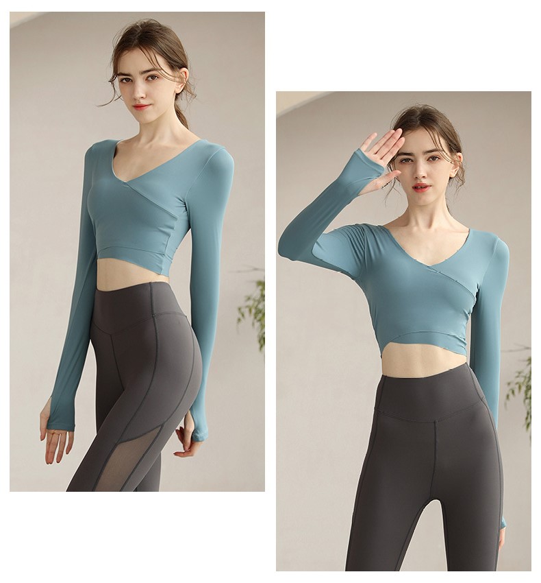 Womens long sleeve crop top V neck strappy padded running fitness tee shirt with thumb hole