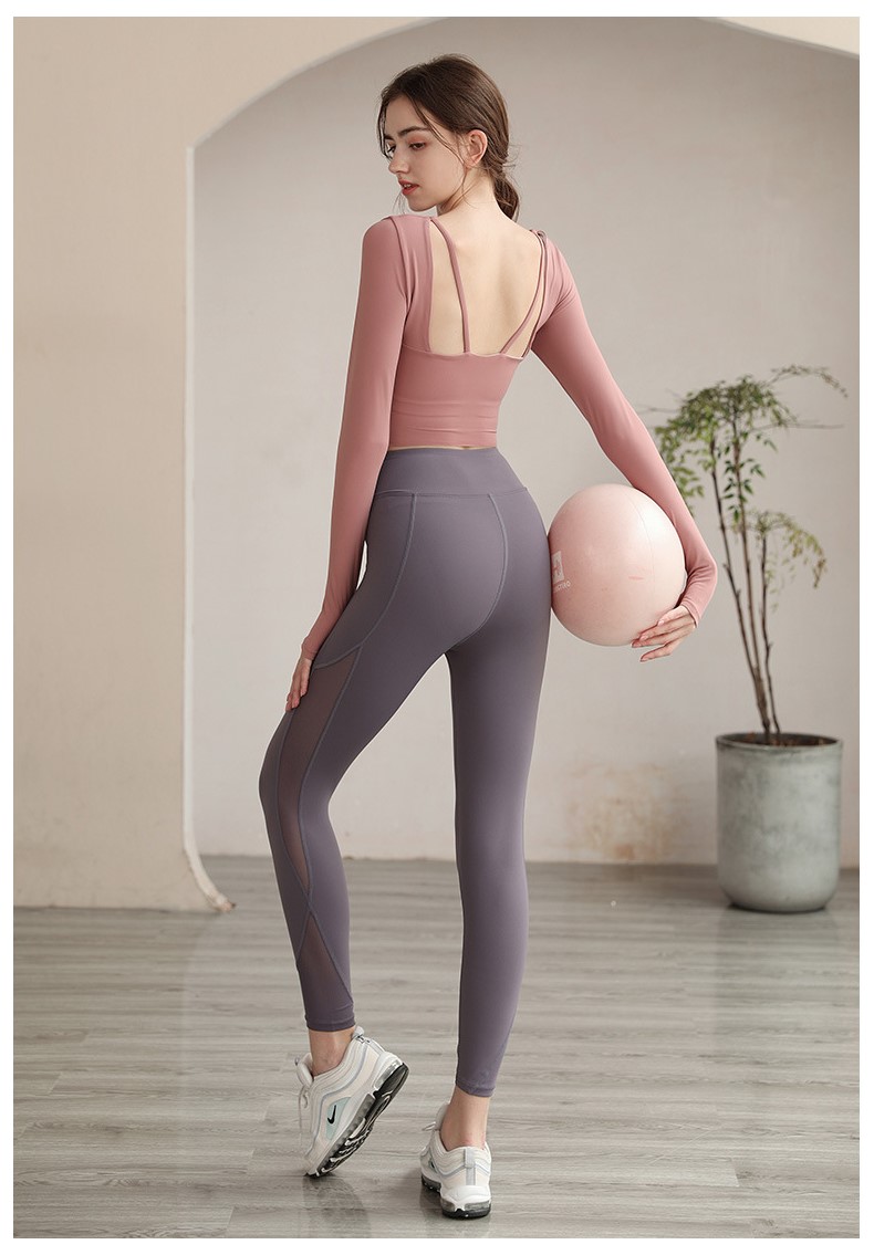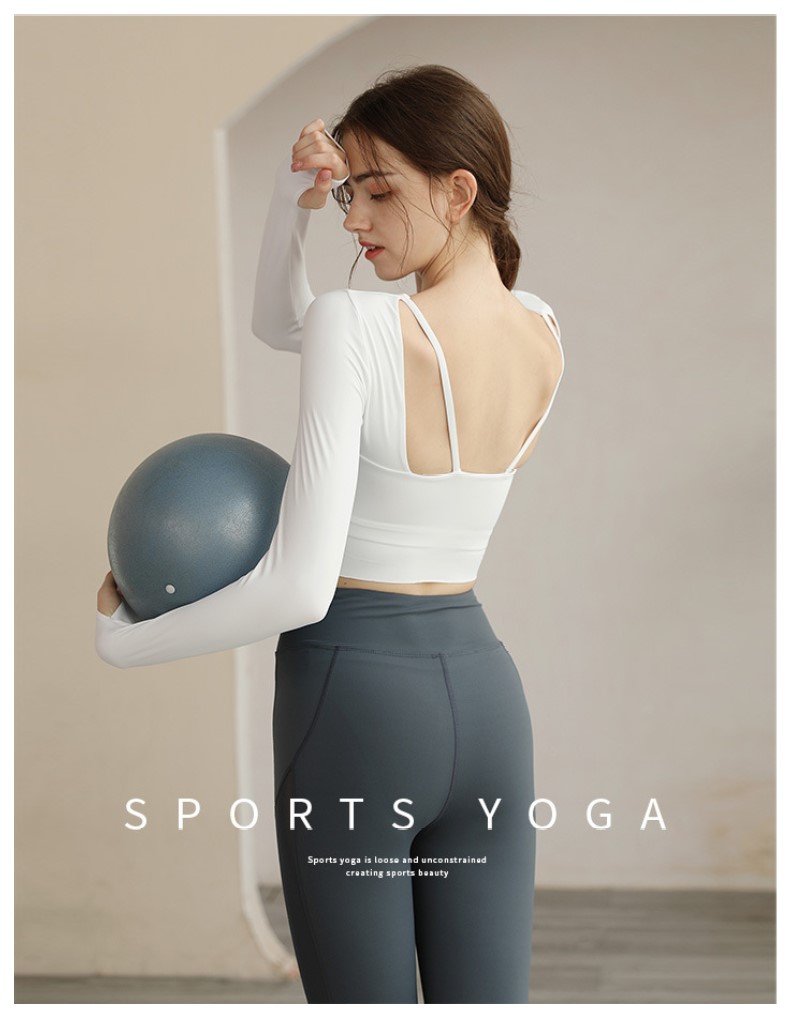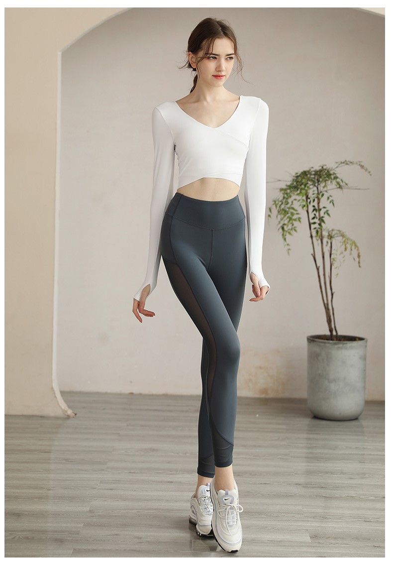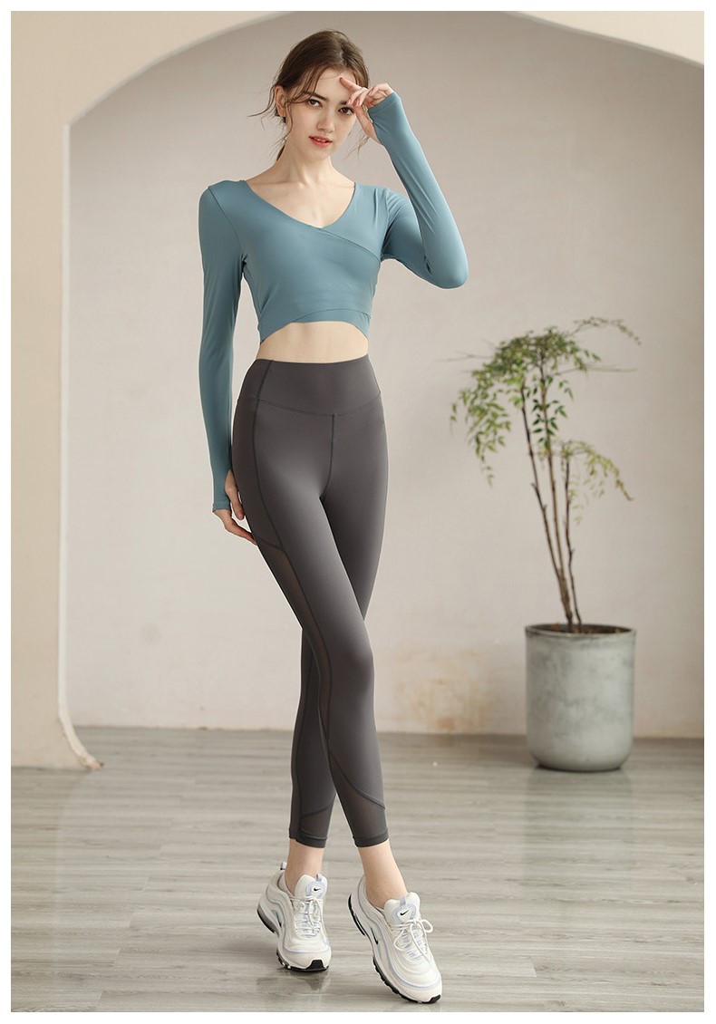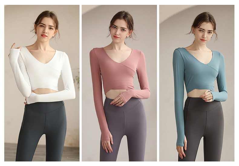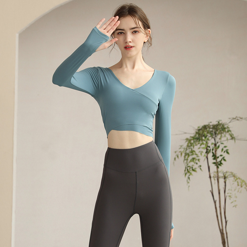 Womens long sleeve crop top V neck strappy padded running fitness tee shirt with thumb hole