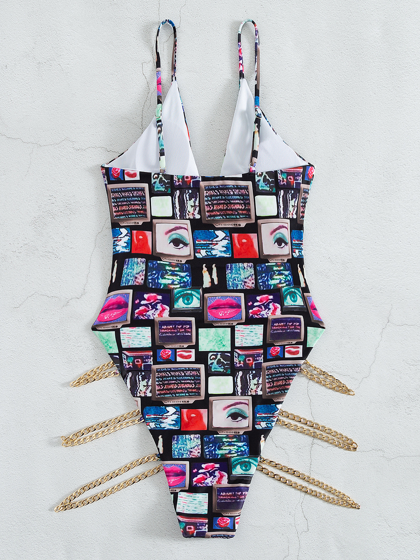 Womens spaghetti strap print monokini V neck bathing suit high cut one piece swimsuit with chain