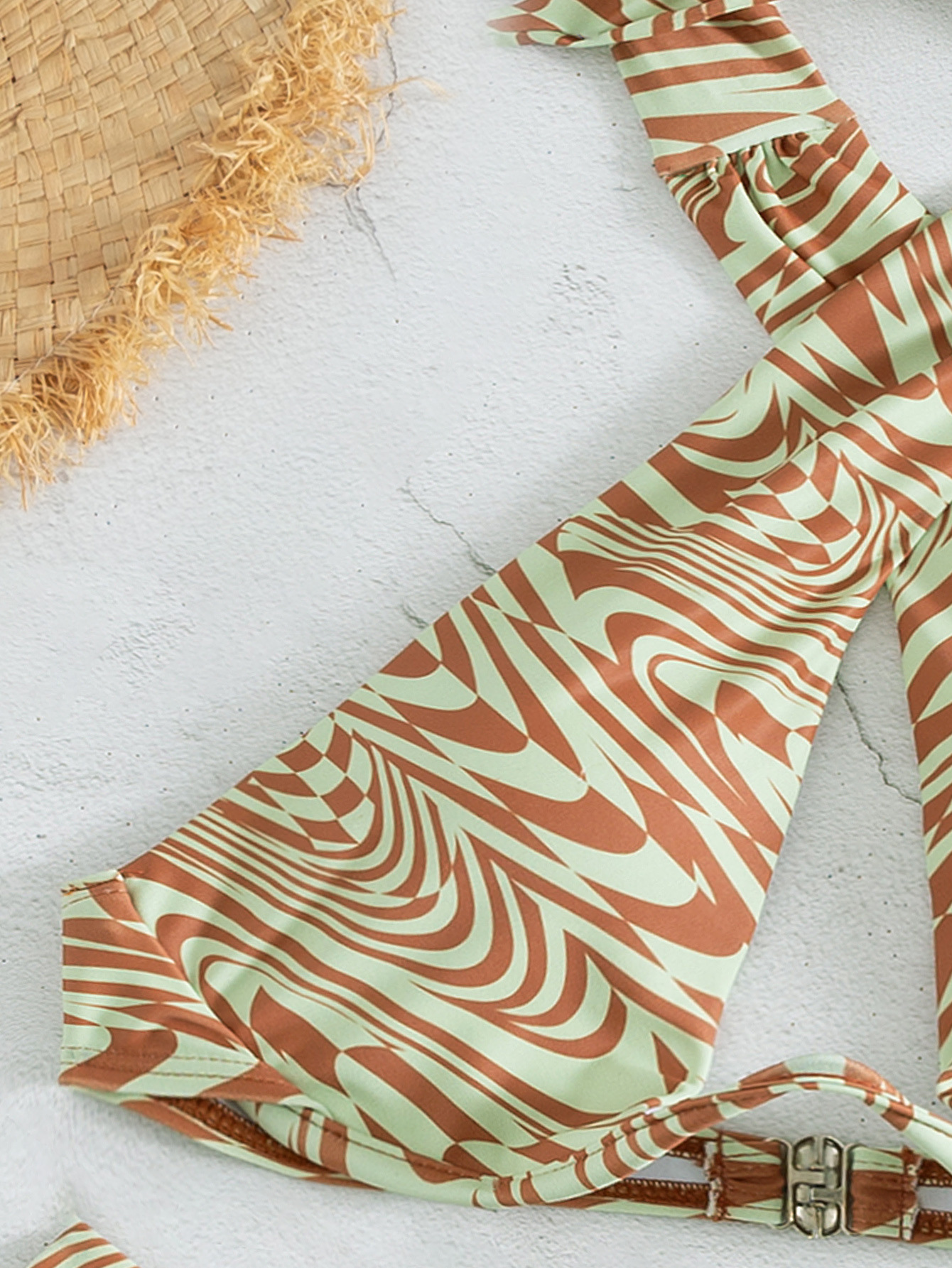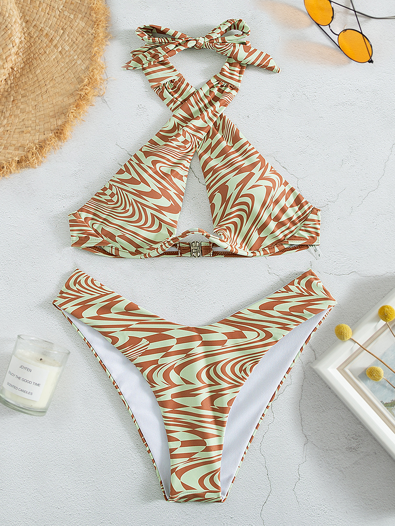 Womens two piece high waisted swimsuits sexy hollow out push up halter bikini striped bathing suits